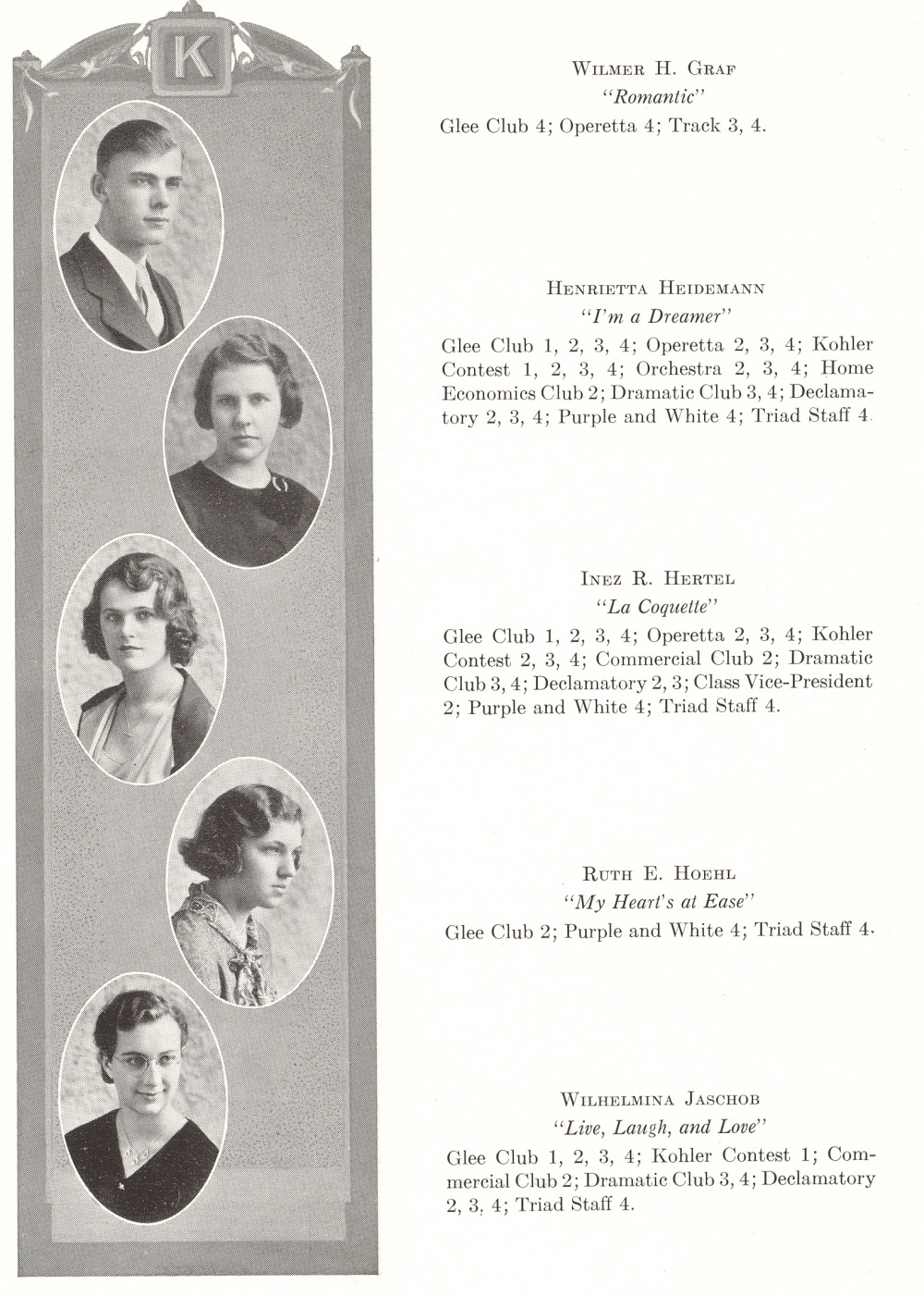 1933 Kiel High School, Page 12: Wilmer Graf, Henrietta Heidemann, Inez Hertel, Ruth Hoehl, Wilhelmina Jaschob.