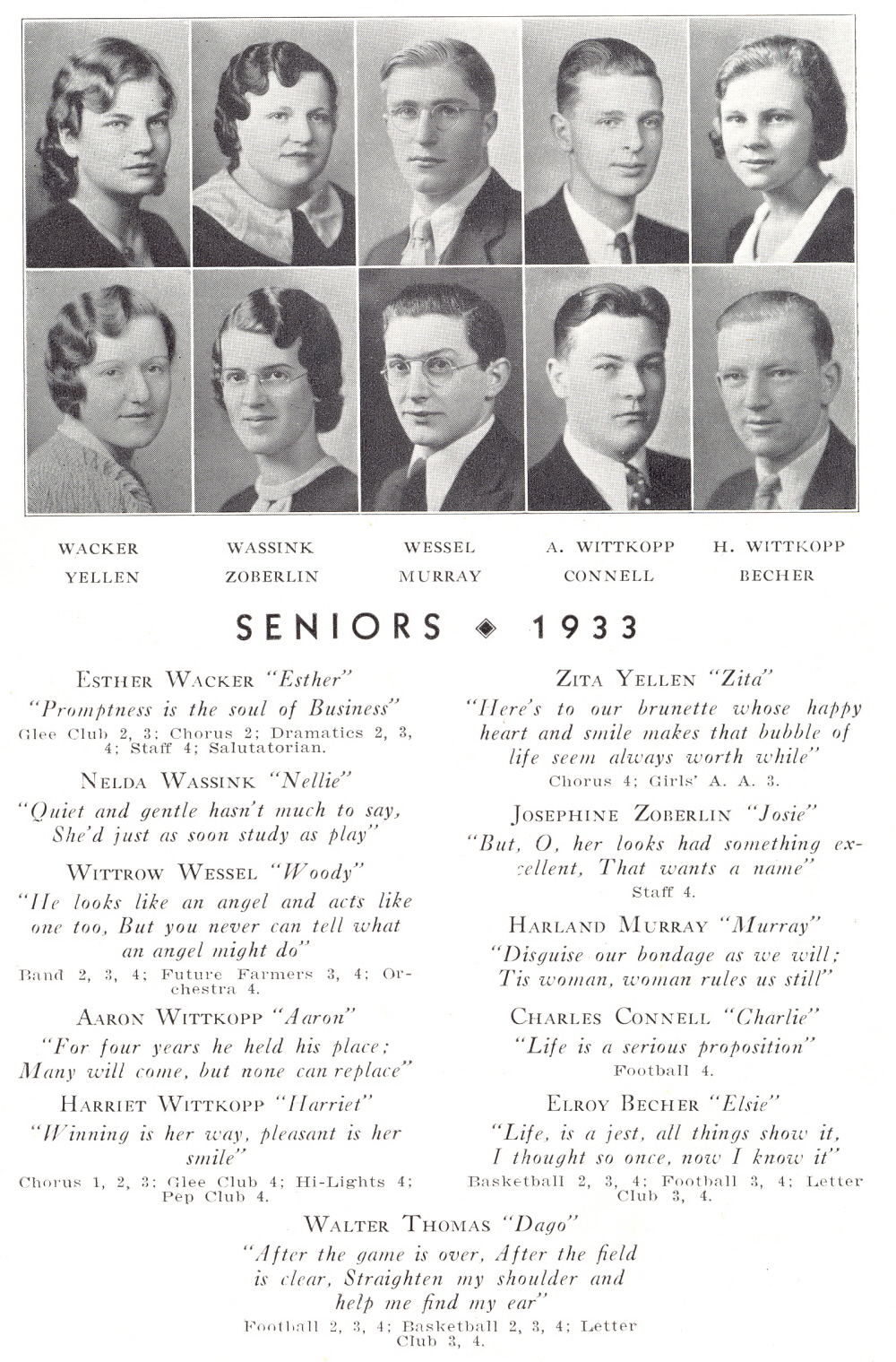 1933 Plymouth High School, Page 18: Esther Wacker, Nelda Wassink, Wittrow Wessel, Aaron Wittkopp, Harriet Wittkopp, Zita Yellen, Josephine Zoberlin, Harland Murray, Charles Connell, Elroy Becher, Walter Thomas.