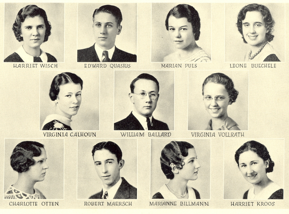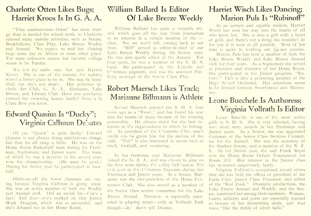1933 Sheboygan High School, Pages 22 and 23: Harriet Wisch, Edward Quasius, Marian Puls, Leone Buechele, Virginia Calhoun, William Ballard, Virginia Vollrath, Charlotte Otten, Robert Maersch, Marianne Billmann, Harriet Kroos.