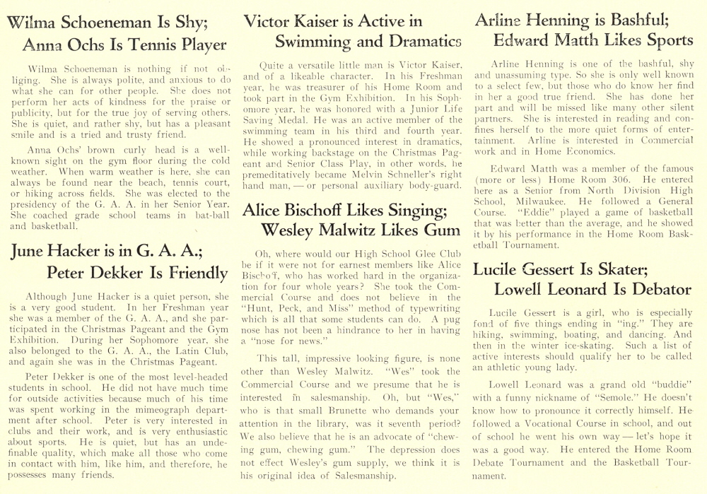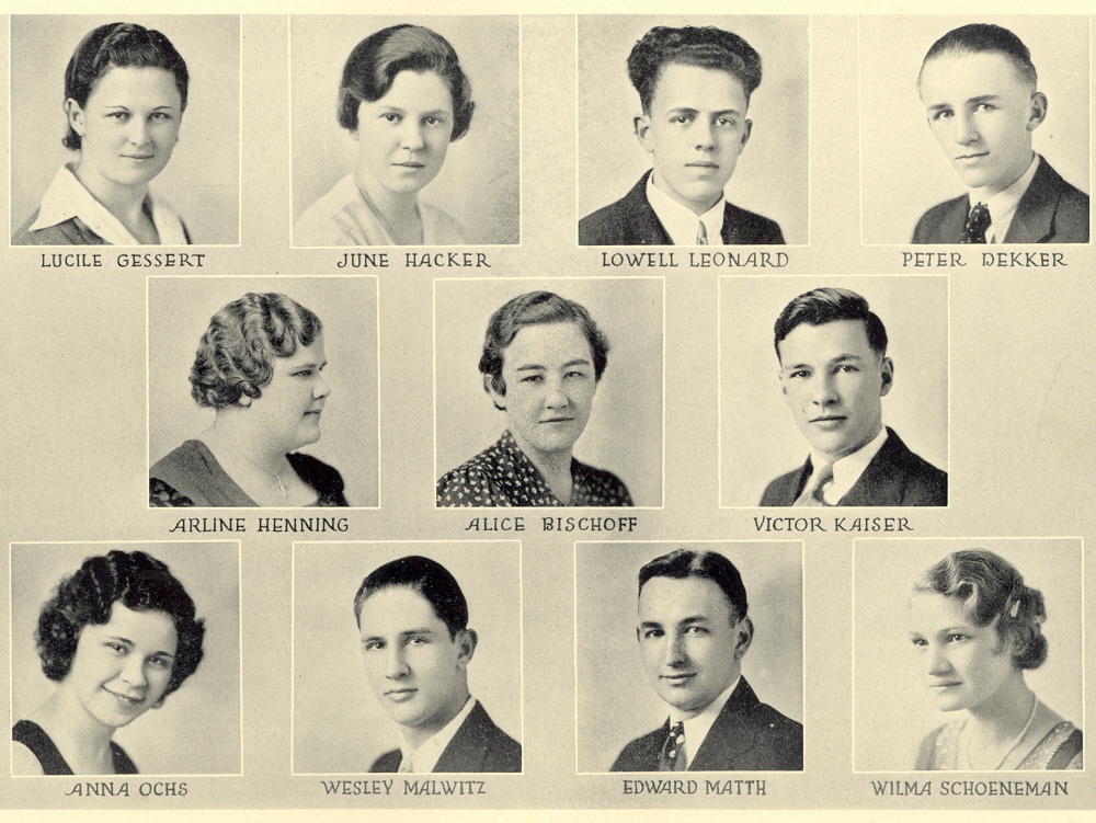 1933 Sheboygan High School, Pages 32 and 33: Lucile Gessert, June Hacker, Lowell Leonard, Peter Dekker, Arline Henning, Alice Bischoff, Victor Kaiser, Anna Ochs, Wesley Malwitz, Edward Matth, Wilma Schoeneman.