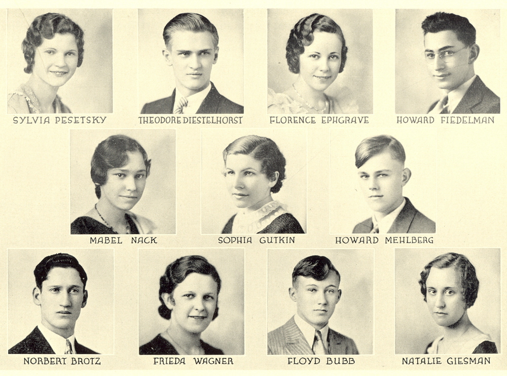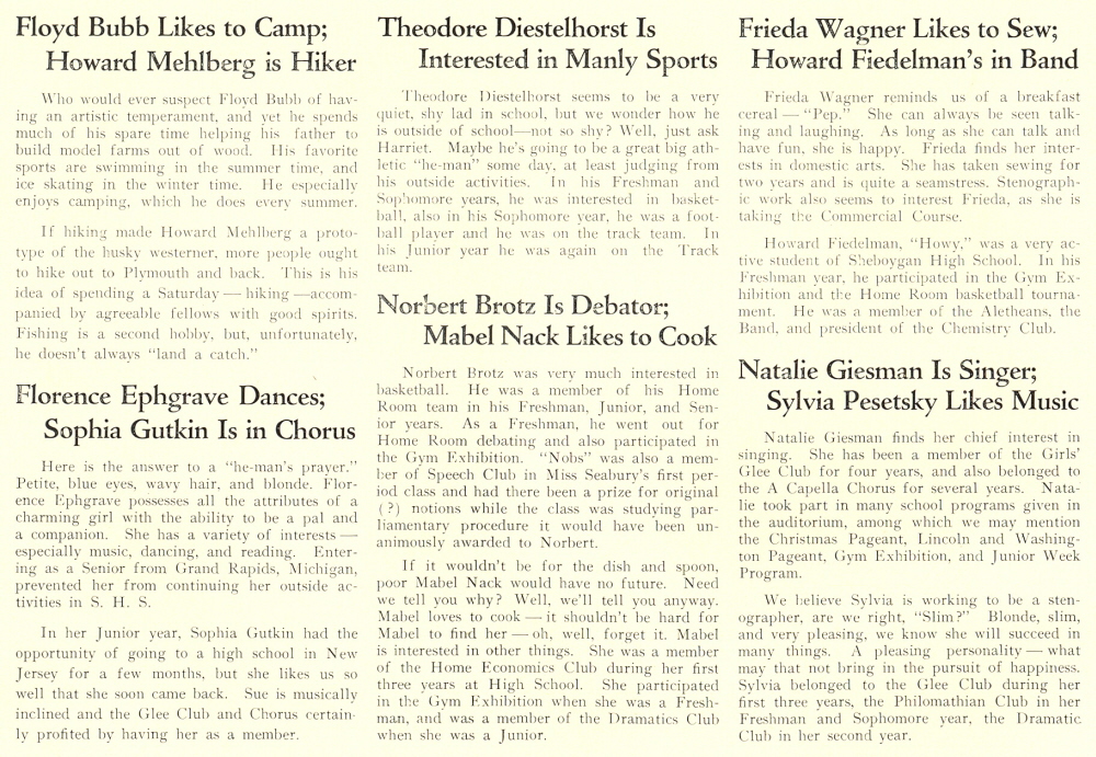 1933 Sheboygan High School, Pages 40 and 41: Sylvia Pesetsky, Theodore Diestelhorst, Florence Ephgrave, Howard Fiedelman, Mabel Nack, Sophia Gutkin, Howard Mehlberg, Norbert Brotz, Frieda Wagner, Floyd Bubb, Natalie Giesman.