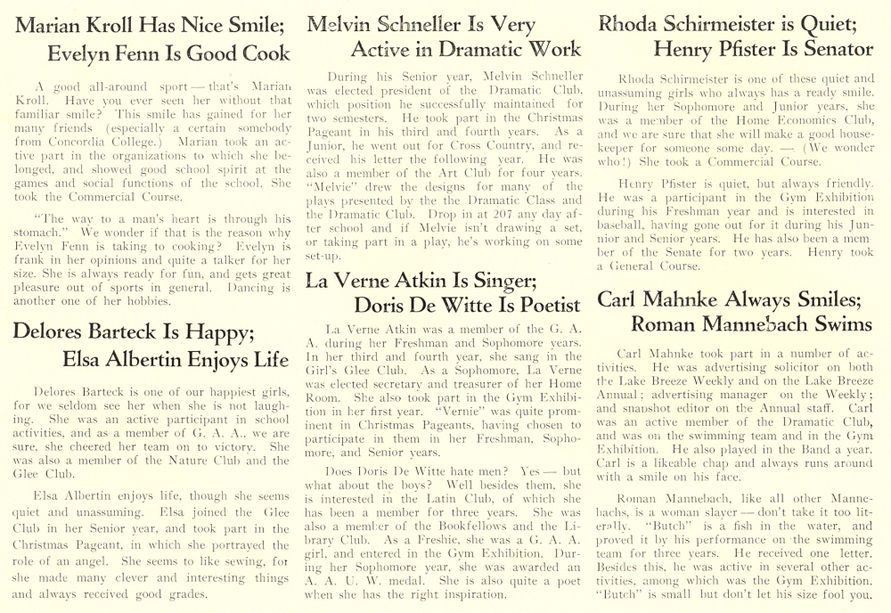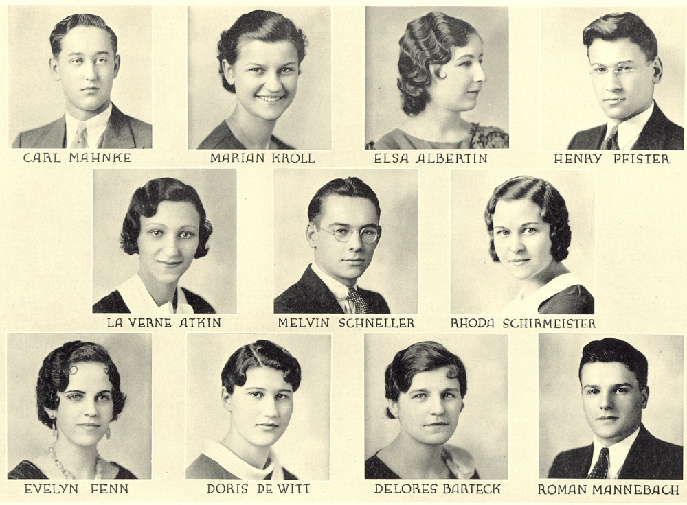 1933 Sheboygan High School, Pages 44 and 45: Carl Mahnke, Marian Kroll, Elsa Albertin, Henry Pfister, La Verne Atkin, Melvin Schneller, Rhoda Schirmeister, Evelyn Fenn, Doris De Witt, Delores Barteck, Roman Mannebach.