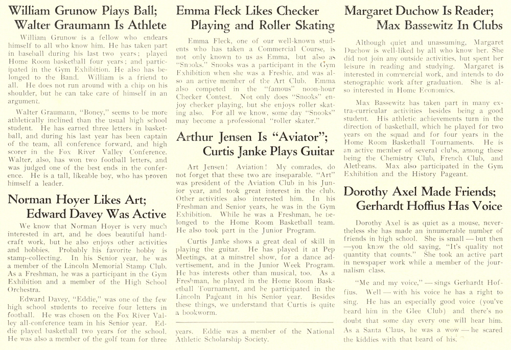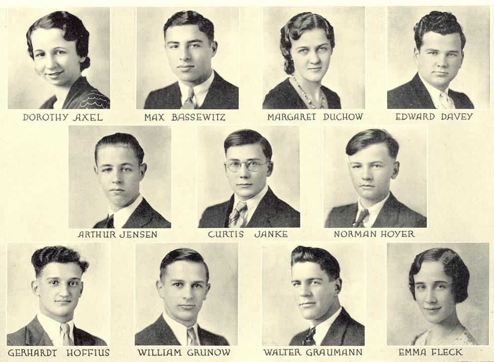 1933 Sheboygan High School, Pages 48 and 49: Dorothy Axel, Max Bassewitz, Margaret Duchow, Edward Davey, Arthur Jensen, Curtis Janke, Norman Hoyer, Gerhardt Hoffius, William Grunow, Walter Graumann, Emma Fleck.