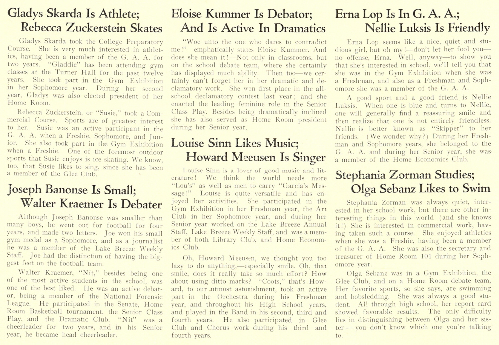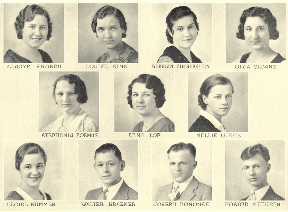 1933 Sheboygan High School, Pages 52 and 53: Gladys Skarda, Louise Sinn, Rebecca Zuckerstein, Stephania Zorman, Erna Lop, Nellie Luksis, Eloise Kummer, Walter Kraemer, Joseph Bononse, Howard Meeusen.