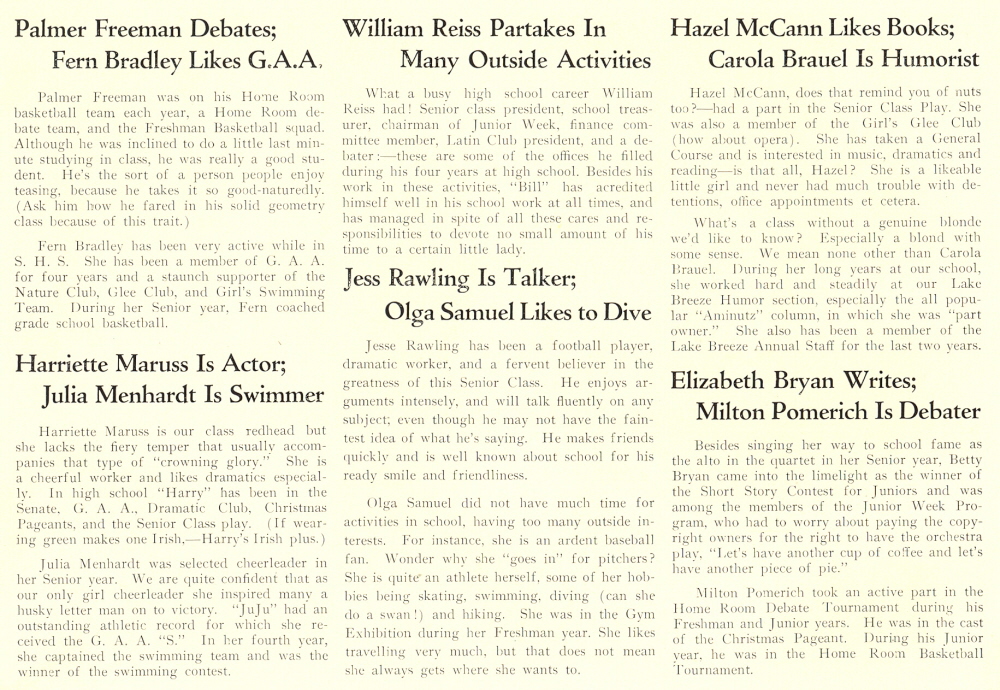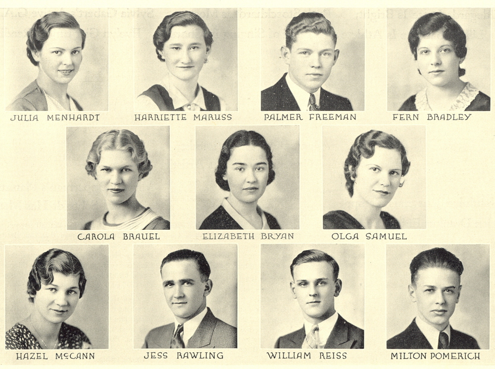 1933 Sheboygan High School, Pages 54 and 55: Julia Menhardt, Harriette Maruss, Palmer Freeman, Fern Bradley, Carola Brauel, Elizabeth Bryan, Olga Samuel, Hazel McCann, Jess Rawling, William Reiss, Milton Ponerich.