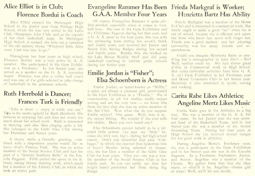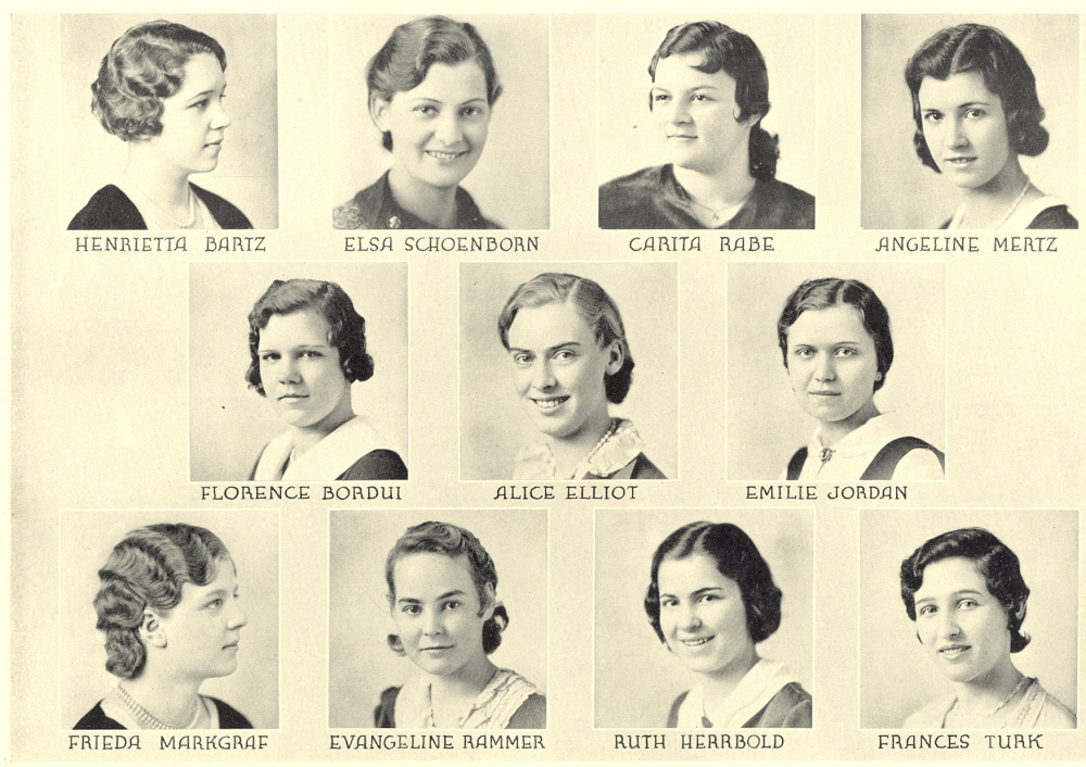 1933 Sheboygan High School, Pages 68 and 69: Henrietta Bartz, Elsa Schoenborn, Carita Rabe, Angeline Mertz, Florence Bordui, Alice Elliot, Emilie Jordan, Frieda Markgraf, Evangeline Rammer, Ruth Herrbold, Frances Turk.