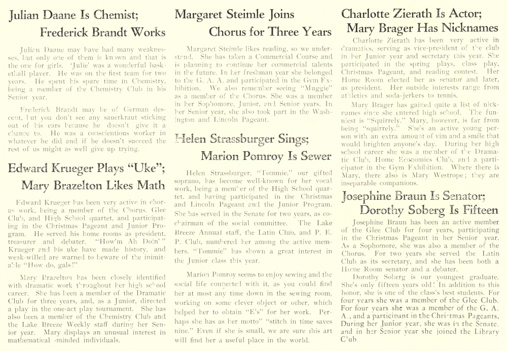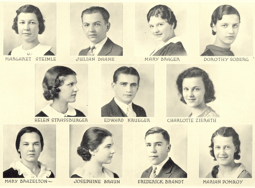 1933 Sheboygan High School, Pages 70 and 71: Margaret Steimle, Julian Daane, Mary Brager, Dorothy Soberg, Helen Strassburger, Edward Krueger, Charlotte Zierath, Mary Brazelton, Josephine Braun, Frederick Brandt, Marian Pomroy.