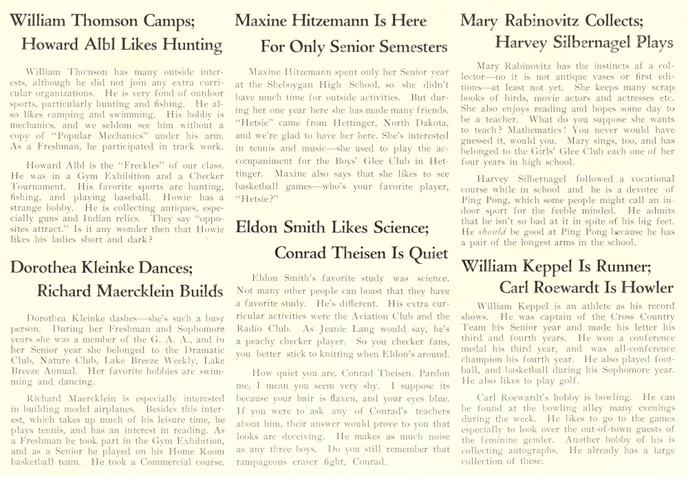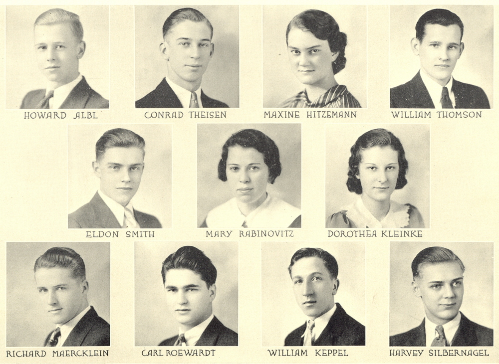 1933 Sheboygan High School, Pages 78 and 79: Howard Albl, Conrad Theisen, Maxine Hitzemann, William Thomson, Eldon Smith, Mary Rabinovitz, Dorothea Kleinke, Richard Maercklein, Carl Roewardt, William Keppel, Harvey Silbernagel.