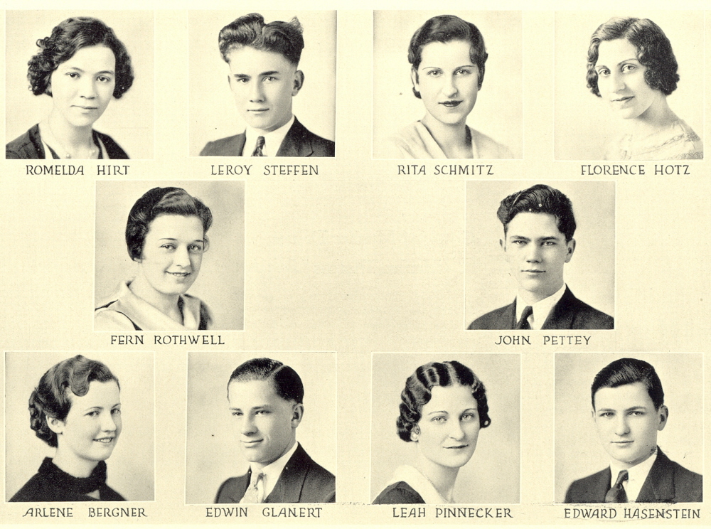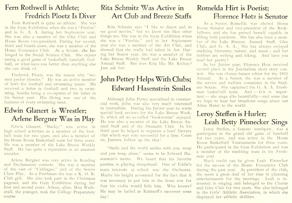 1933 Sheboygan High School, Pages 82 and 83: Romelda Hirt, Leroy Steffen, Rita Schmitz, Florence Hotz, Fern Rothwell, John Pettey, Arlene Bergner, Edwin Glanert, Leah Pinnecker, Edward Hasenstein.