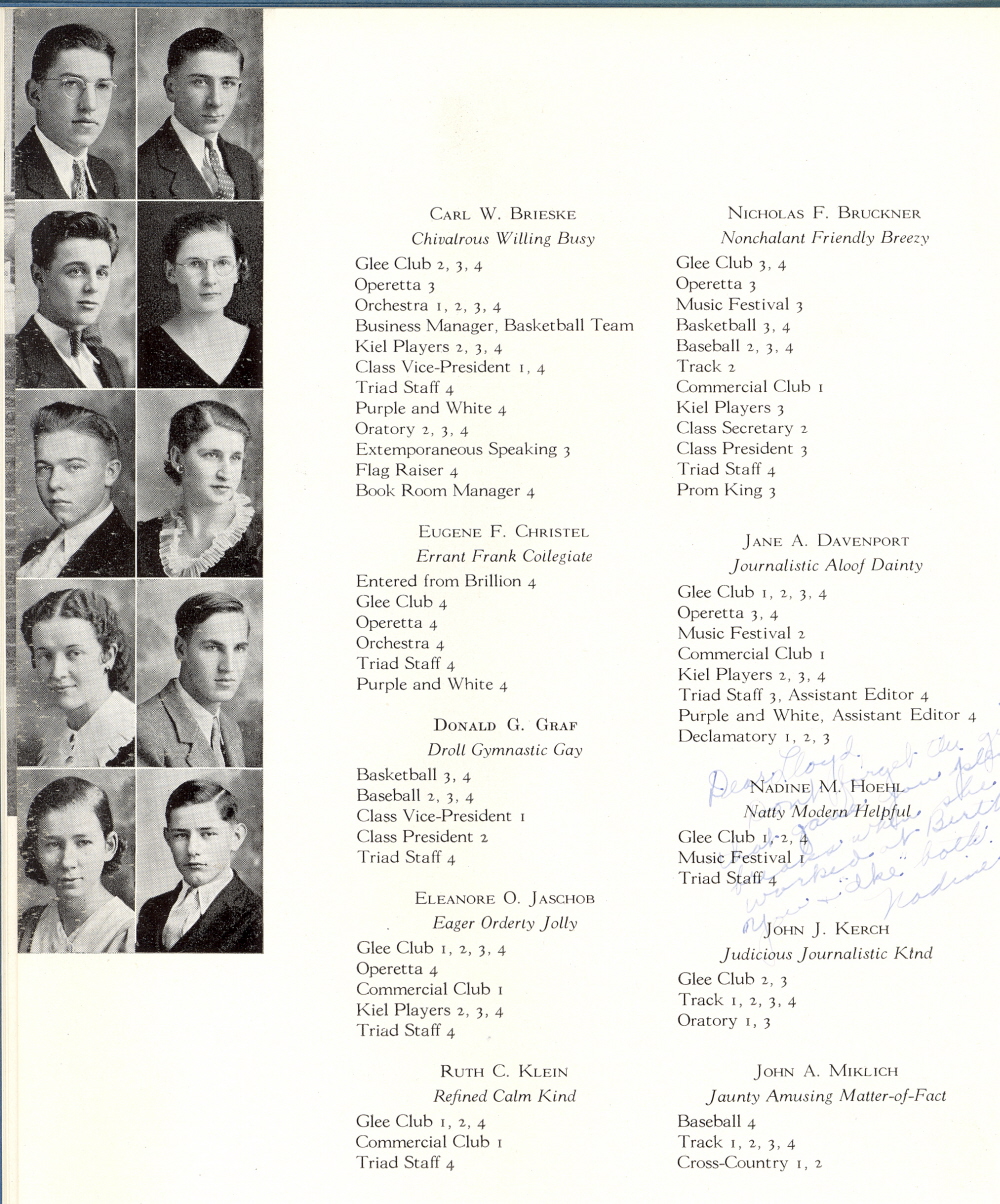 1934 Kiel High School, Page 10: Carl Brieske, Nicholas Bruckner, Eugene Christel, Jane Davenport, Donald Graf, Nadine Hoehl, Eleanore Jaschob, John Kerch, Ruth Klein, John Miklich.