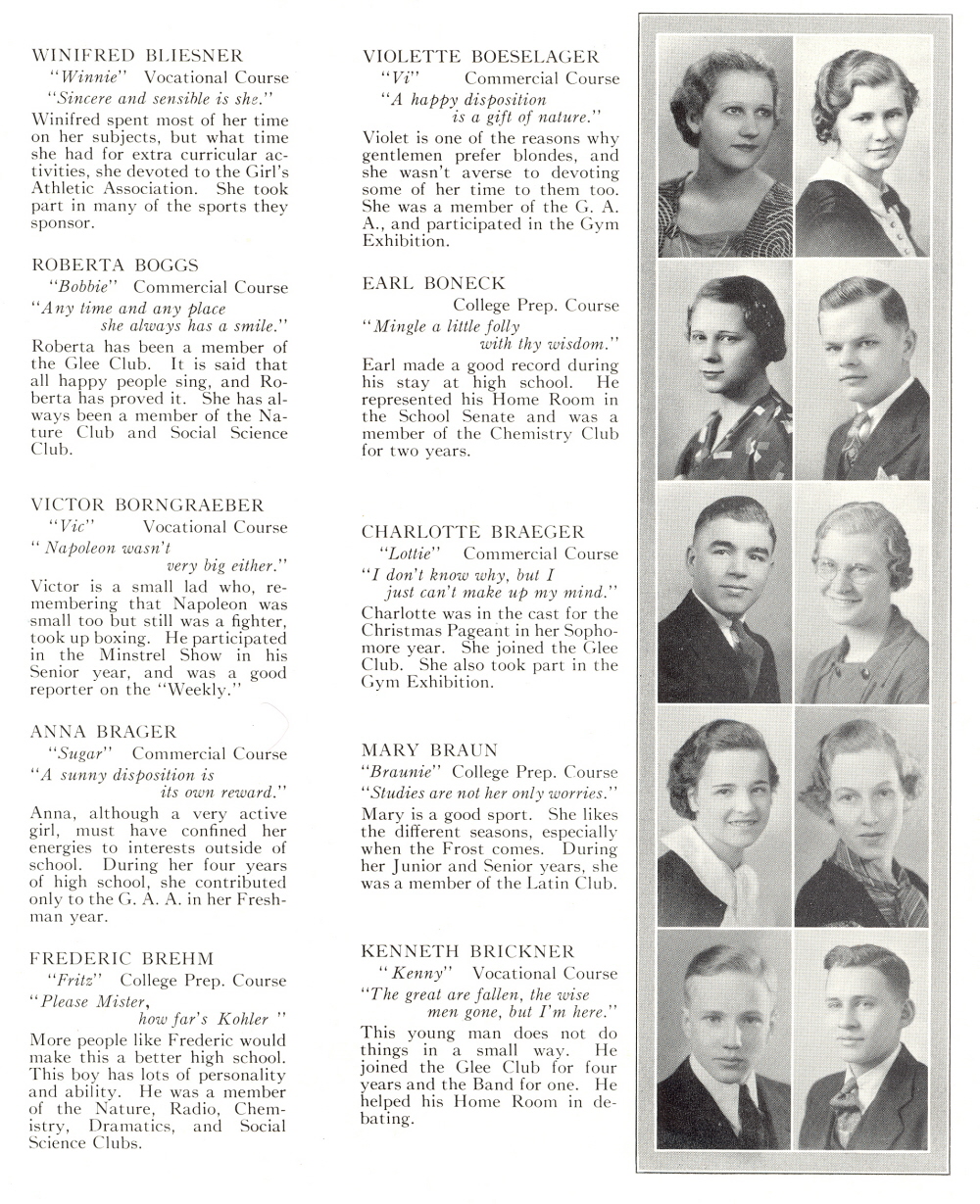 1934 Sheboygan High School, Page 19: Winifred Bliesner, Violette Boeselager, Roberta Boggs, Earl Boneck, Victor Borngraeber, Charlotte Braeger, Anna Brager, Mary Braun, Frederic Brehm, Kenneth Brickner.