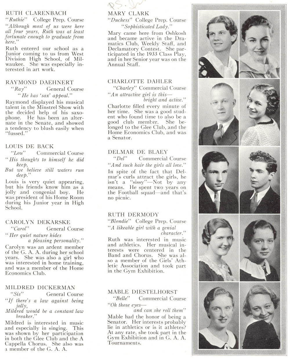 1934 Sheboygan High School, Page 21: Ruth Clarenbach, Mary Clark, Raymond Daehnert, Charlotte Dahler, Louis De Back, Delmar De Blaey, Carolyn Dekarske, Ruth Dermody, Mildred Dickerman, Mable Diestelhorst.