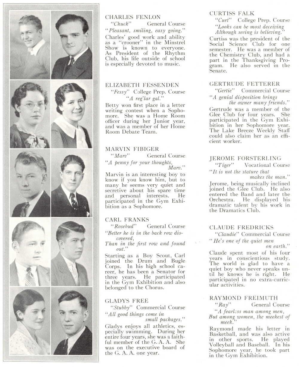 1934 Sheboygan High School, Page 24: Charles Fenlon, Curtiss Falk, Elizabeth Fessenden, Gertrude Fetterer, Marvin Fibiger, Jerome Forsterling, Carl Franks, Claude Fredricks, Gladys Free, Raymond Freimuth.