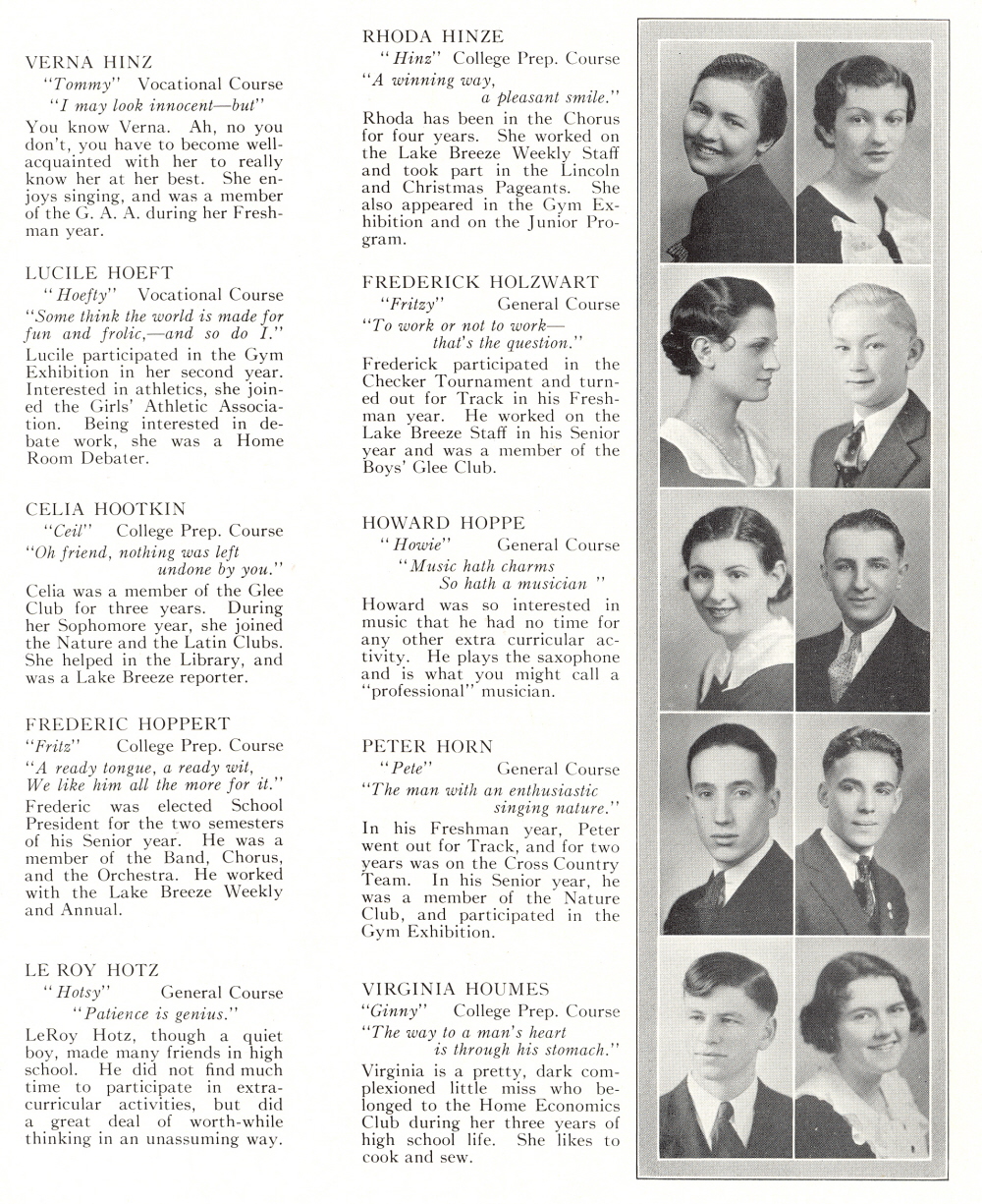 1934 Sheboygan High School, Page 29: Verna Hinz, Rhoda Hinze, Lucile Hoeft, Frederick Holzwart, Celia Hootkin, Howard Hoppe, Frederic Hoppert, Peter Horn, Le Roy Hotz, Virginia Houmes.