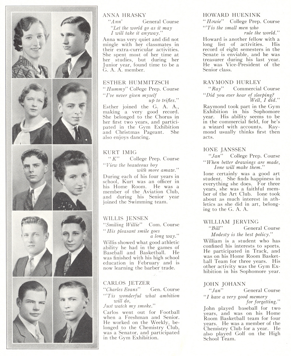 1934 Sheboygan High School, Page 30: Anna Hrasky, Howard Huenink, Esther Hummitzsch, Raymond Hurley, Kurt Imig, Ione Janssen, Willis Jensen, William Jerving, Carlos Jetzer, John Johann.