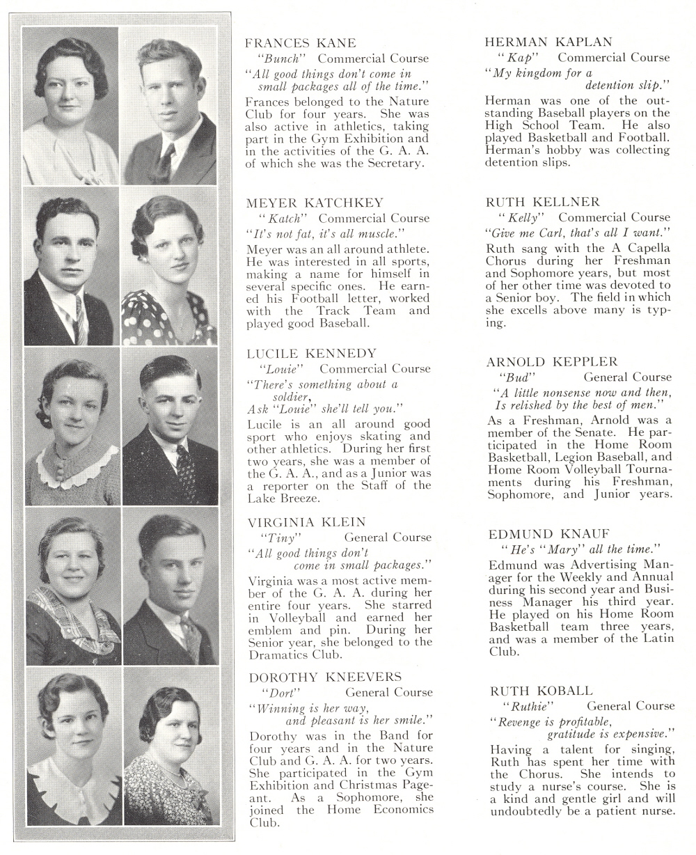 1934 Sheboygan High School, Page 32: Frances Kane, Herman Kaplan, Meyer Katchkey, Ruth Kellner, Lucile Kennedy, Arnold Keppler, Virginia Klein, Edmund Knauf, Dorothy Kneevers, Ruth Koball.