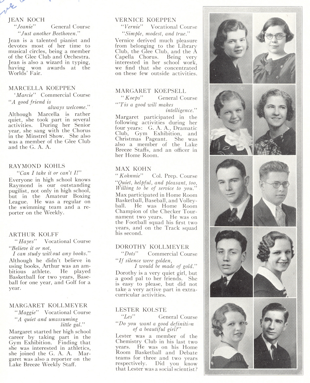 1934 Sheboygan High School, Page 33: Jean Koch, Vernice Koeppen, Marcella Koeppen, Margaret Koepsell, Raymond Kohls, Max Kohn, Arthur Kolff, Dorothy Kollmeyer, Margaret Kollmeyer, Lester Kolste.