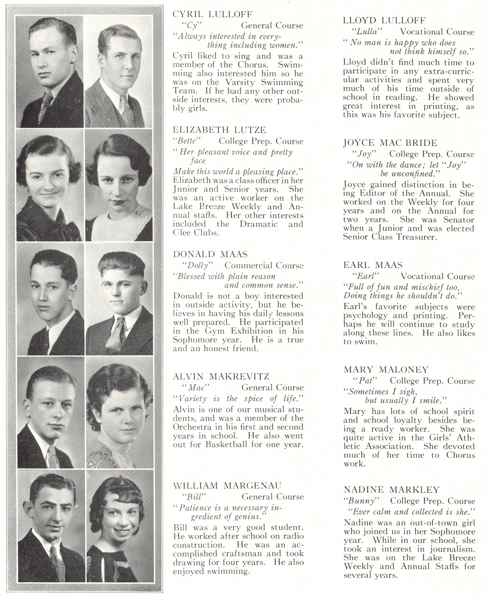 1934 Sheboygan High School, Page 36: Cyril Lulloff, Lloyd Lulloff, Elizabeth Lutze, Joyce Mac Bride, Donald Maas, Earl Maas, Alvin Makrevitz, Mary Maloney, William Margenau, Nadine Markley.