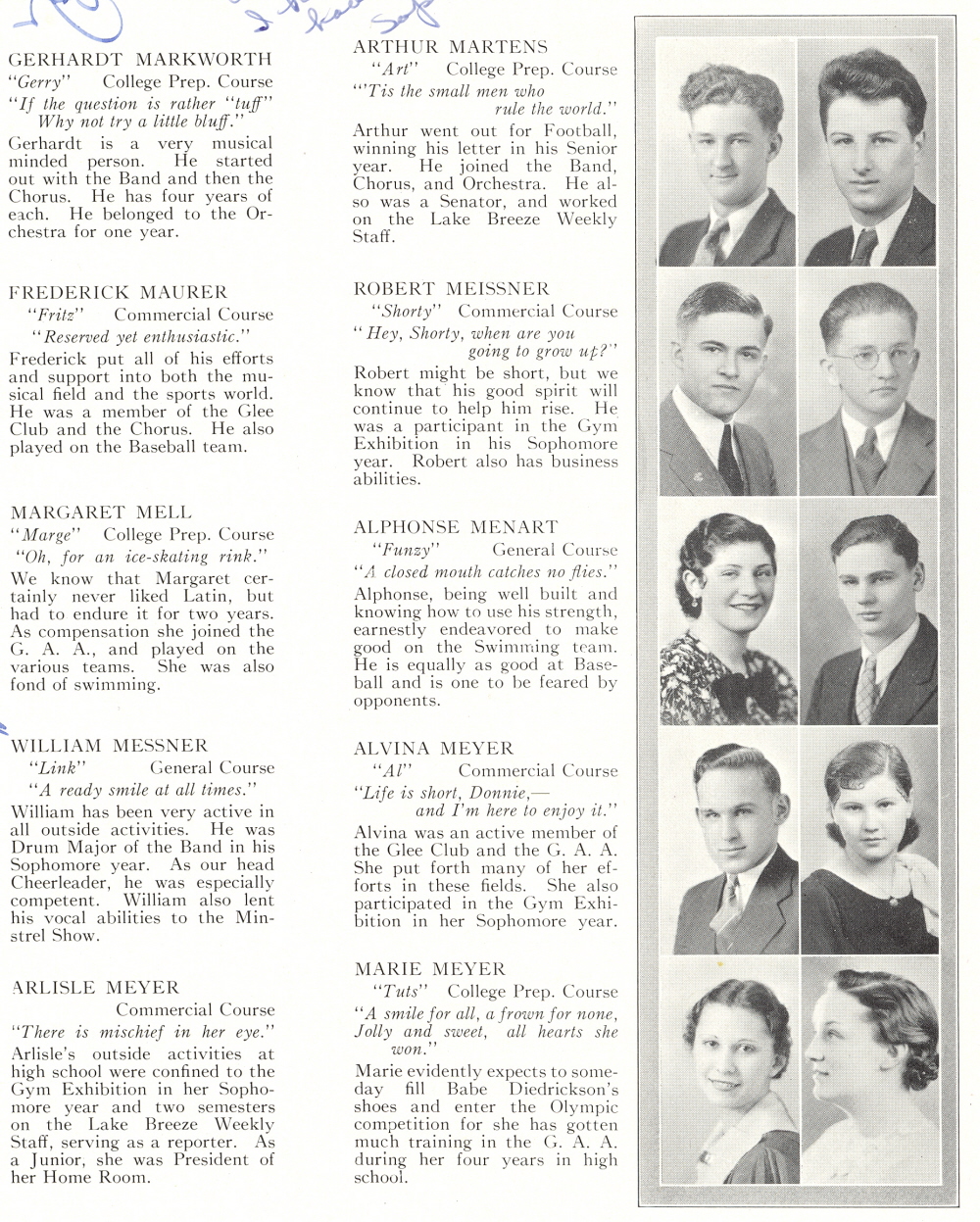1934 Sheboygan High School, Page 37: Gerhardt Markworth, Arthur Martens, Frederick Maurer, Robert Meissner, Margaret Mell, Alphonse Menart, William Messner, Alvina Meyer, Arlsile Meyer, Marie Meyer.
