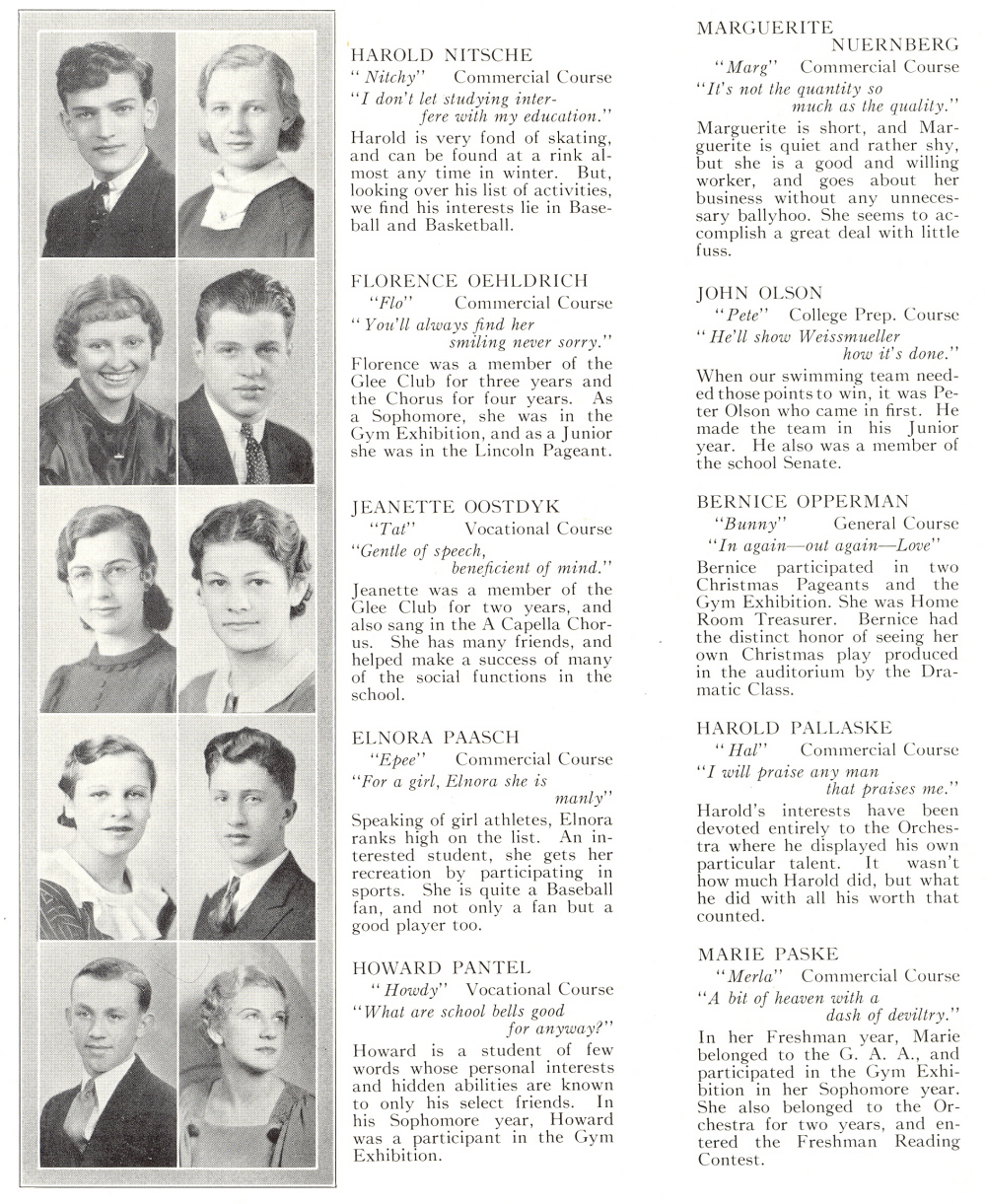 1934 Sheboygan High School, Page 40: Harold Nitsche, Marguerite Nuernberg, Florence Oehldrich, John Olson, Jeanette Oostdyk, Bernice Opperman, Elnora Paasch, Harold Pallaske, Howard Pantel, Marie Paske.