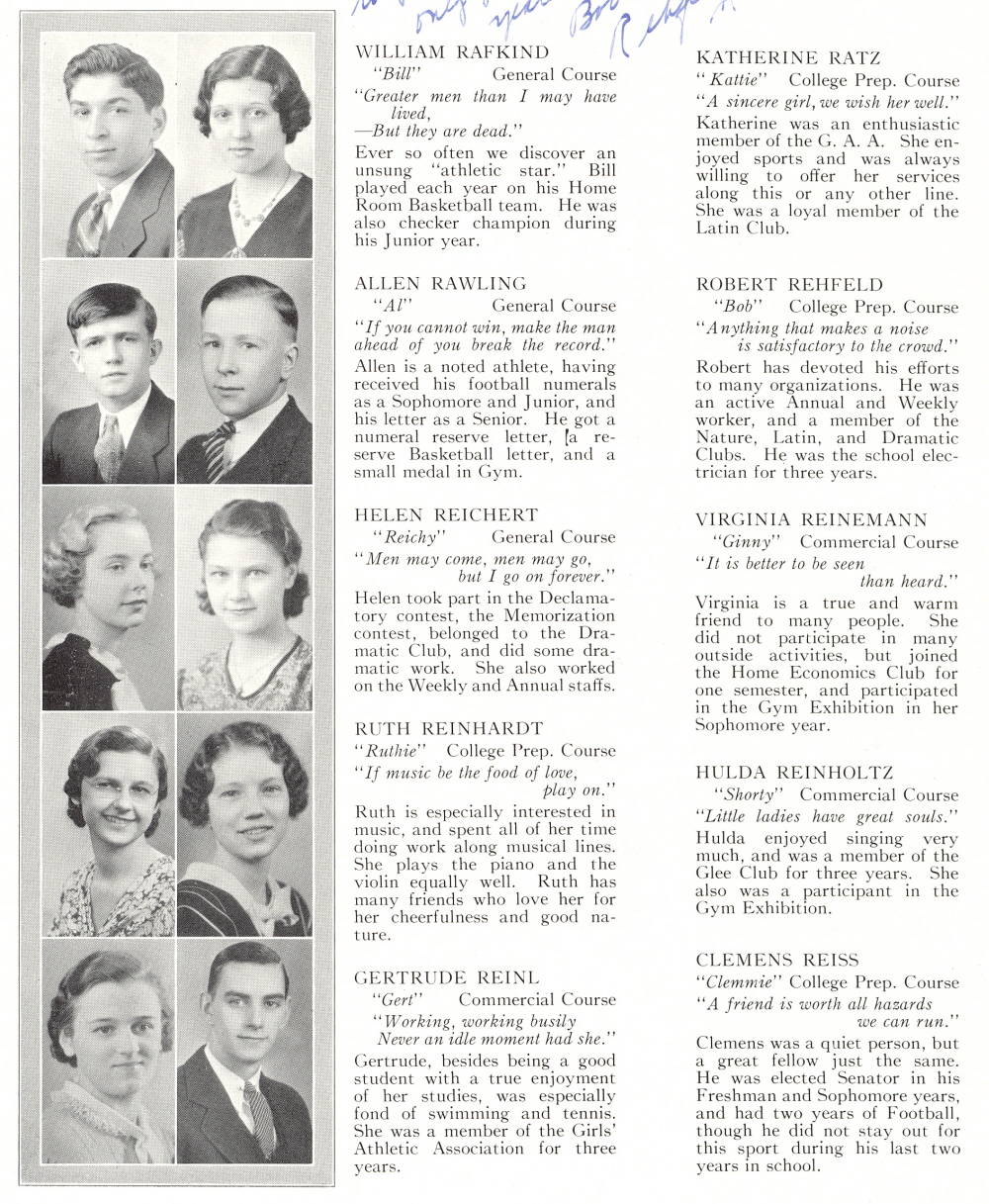 1934 Sheboygan High School, Page 42: William Rafkind, Katherine Ratz, Allen Rawling, Robert Rehfeld, Helen Reichert, Virginia Reinemann, Ruth Reinhardt, Hulda Reinholtz, Gertrude Reinl, Clemens Reiss.