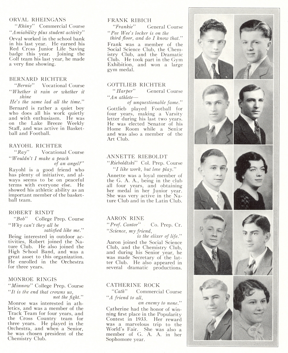 1934 Sheboygan High School, Page 43: Orval Rheingans, Frank Ribich, Bernard Richter, Gottlieb Richter, Rayohl Richter, Annette Rieboldt, Robert Rindt, Aaron Rine, Monroe Ringis, Catherine Rock.