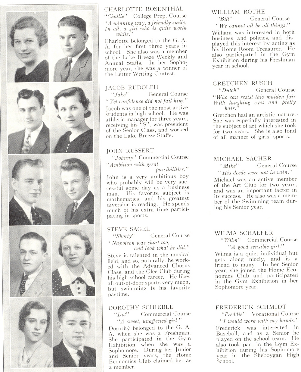 1934 Sheboygan High School, Page 44: Charlotte Rosenthal, William Rothe, Jacob Rudolph, Gretchen Rusch, John Russert, Michael Sacher, Steve Sagel, Wilma Schaefer, Dorothy Schieble, Frederick Schmidt.