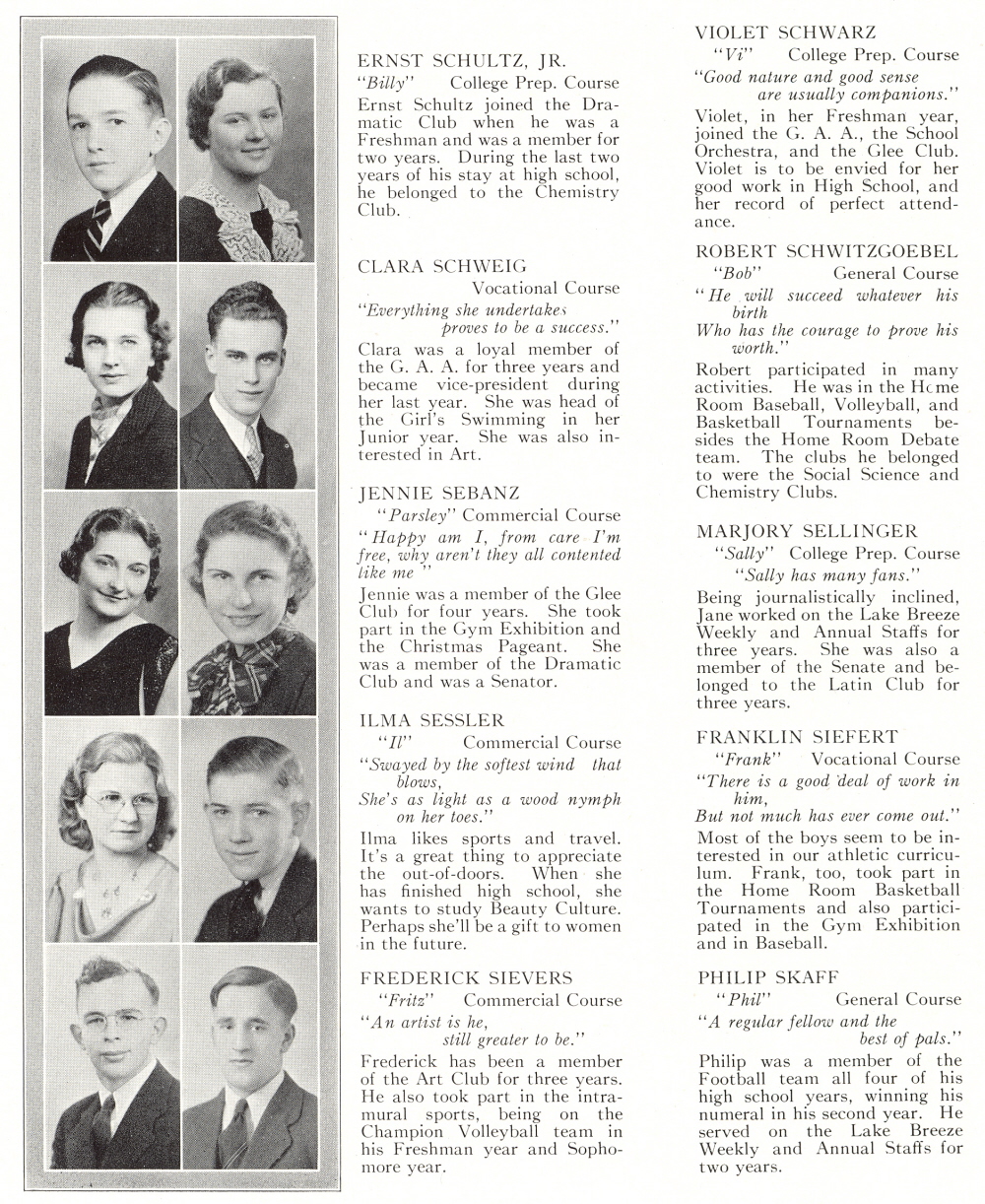 1934 Sheboygan High School, Page 46: Ernst Schultz, Violet Schwarz, Clara Schweig, Robert Schwitzgoebel, Jennie Sebanz, Marjory Sellinger, Ilma Sessler, Franklin Siefert, Frederick Sievers, Philip Skaff.