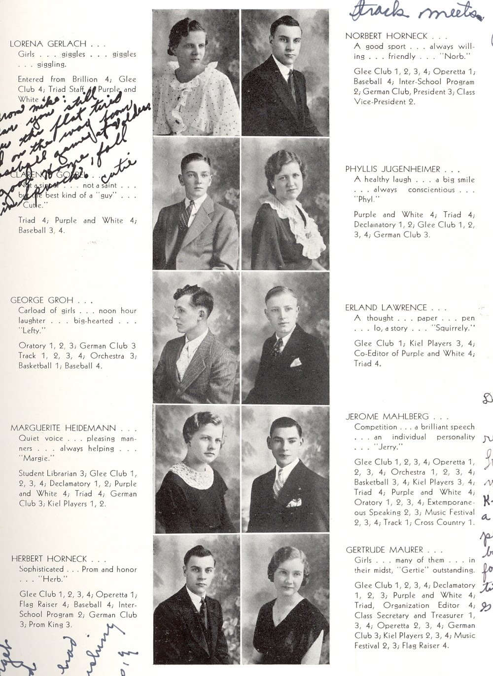 1935 Kiel High School, Page 11: Lorena Gerlach, Clarence Goerel, George Groh, Marguerite Heidemann, Herbert Horneck, Norbert Horneck, Phyllis Jugenheimer, Erland Lawrence, Jerome Mahlberg, Gertrude Maurer.