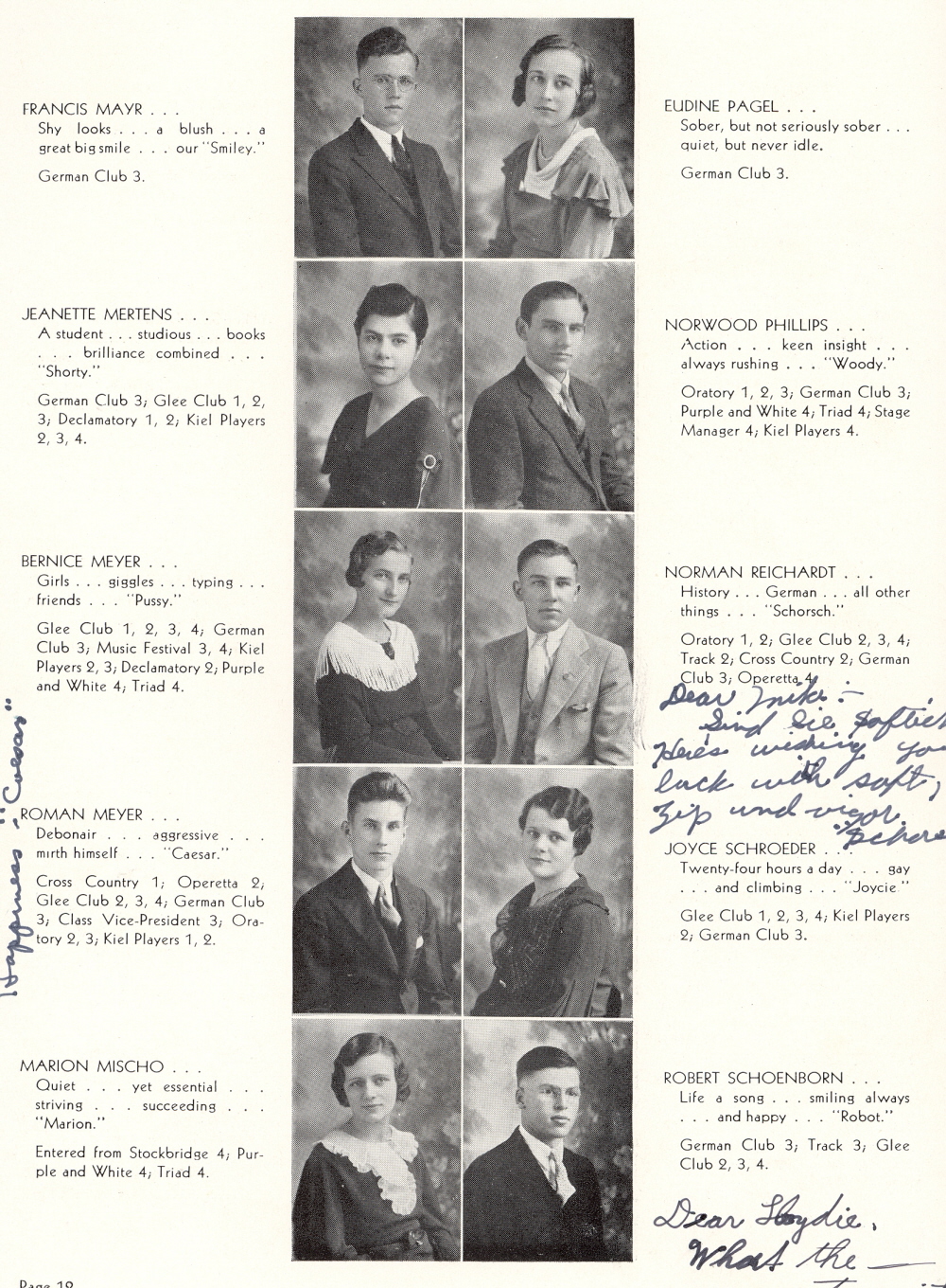1935 Kiel High School, Page 12: Francis Mayr, Jeanette Mertens, Bernice Meyer, Roman Meyer, Marion Mischo, Eudine Pagel, Norwood Phillips, Norman Reichardt, Joyce Schroeder, Robert Schoenborn.