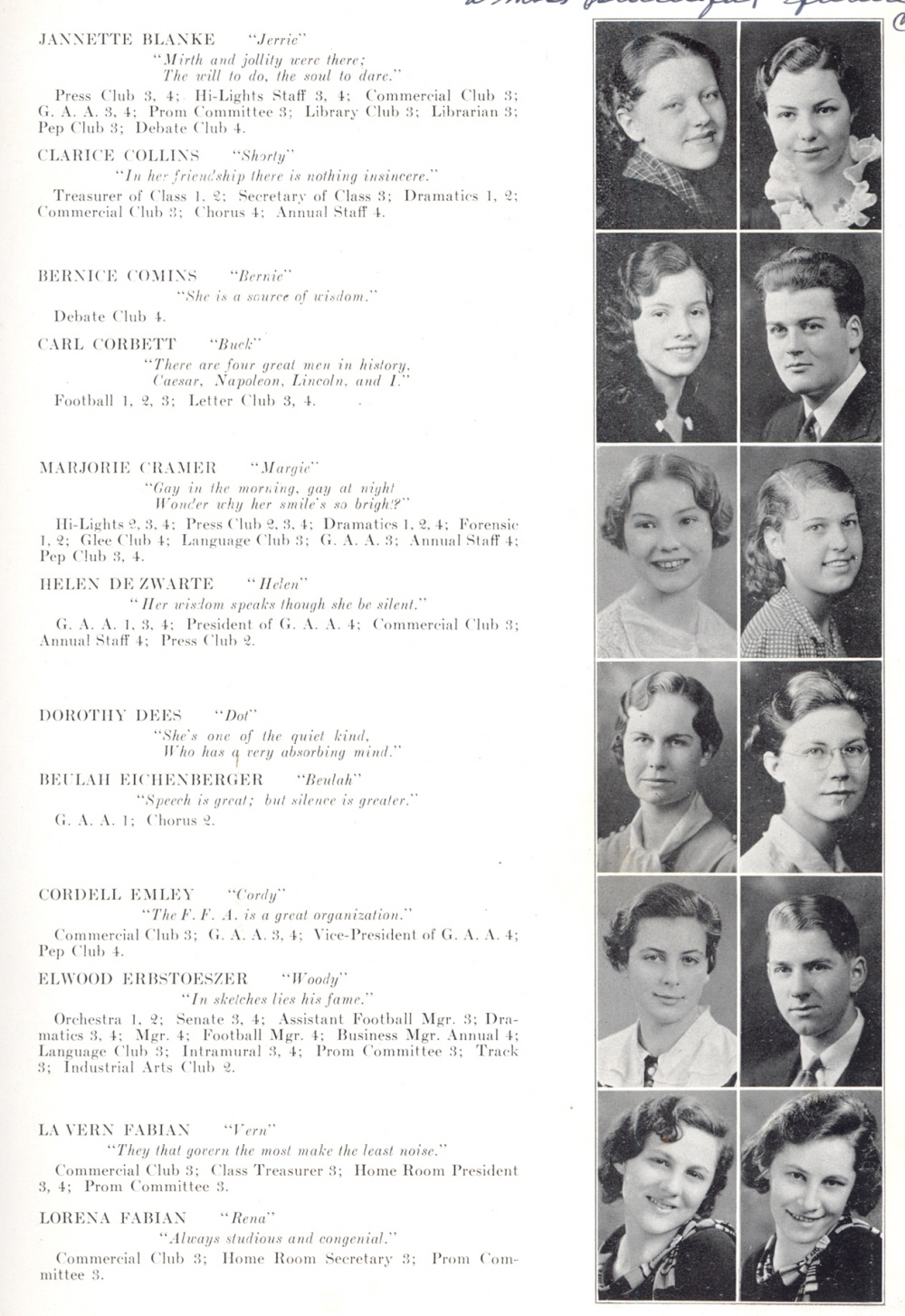 1935 Plymouth High School, Page 11: Jannette Blanke, Clarice Collins, Bernice Comins, Carl Corbett, Marjorie Cramer, Helen De Zwarte, Dorothy Dees, Beulah Eichenberger, Cordell Emley, Elwood Erbstoeszer, La Vern Fabian, Lorena Fabian.