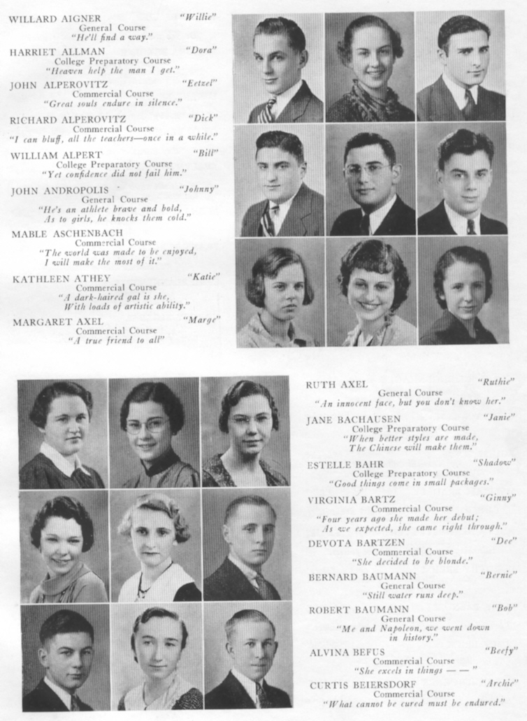 1935 Sheboygan High School, Page 79: Willard Aigner, Harriet Allman, John Alperovitz, Richard Alperovitz, William Alpert, John Andropolis, Mable Aschenbach, Kathleen Athey, Margaret Axel, Ruth Axel, Jane Bachausen, Estelle Bahr, Virginia Bartz, Devota Bartzen, Bernard Baumann, Robert Baumann, Alvina Befus, Curtisn Beiersdorf.