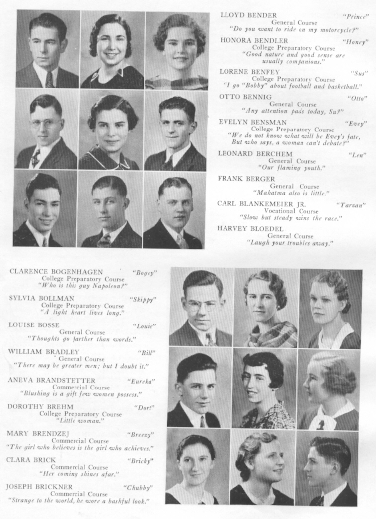 1935 Sheboygan High School, Page 80: Lloyd Bender, Honora Bendler, Lorene Benfey, Otto Bennig, Evelyn Bensman, Leonard Berchem, Frank Berger, Carl Blankemeier, Harvey Bloedel, Clarence Bogenhagen, Sylvia Bollman, Louise Bosse, William Bradley, Aneva Brandstetter, Dorothy Brehm, Mary Brendzej, Clara Brick, Joseph Brickner.