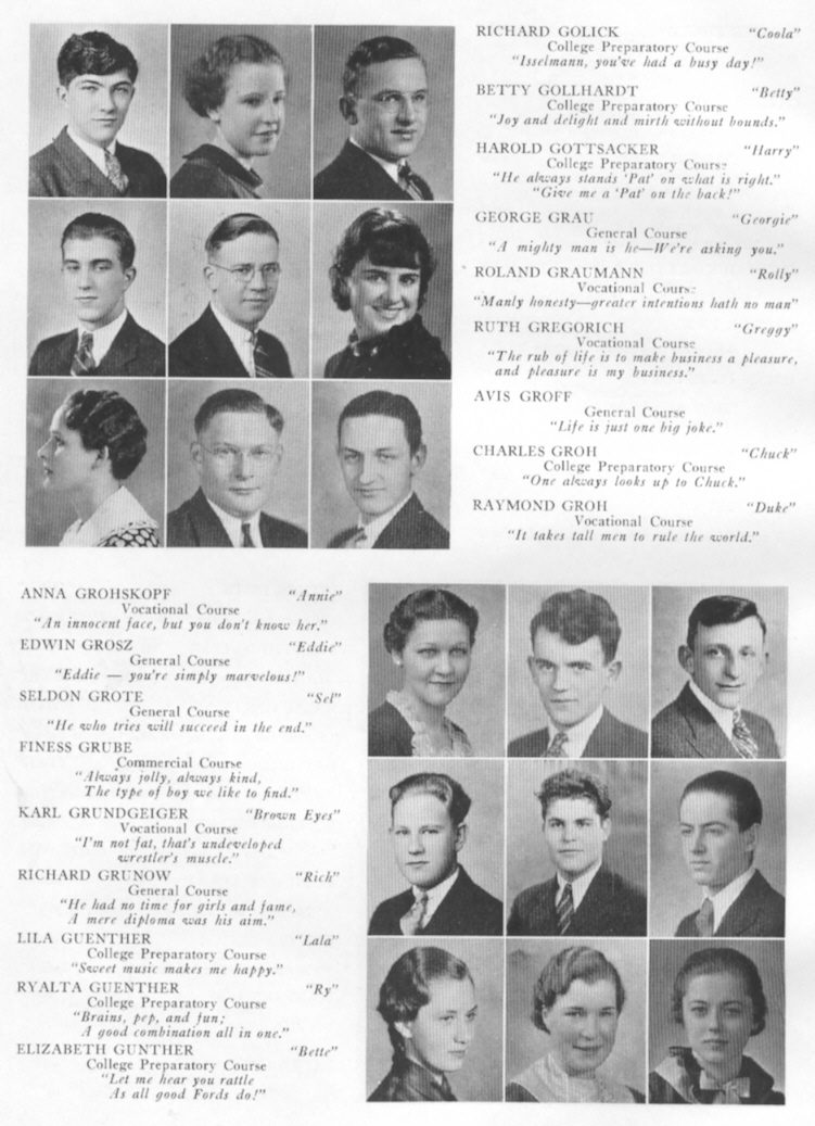 1935 Sheboygan High School, Page 84: Richard Golick, Betty Gollhardt, Harold Gottsacker, George Grau, Roland Graumann, Ruth Gregorich, Avis Groff, Charles Groh, Raymond Groh, Anna Grohskopf, Edwin Grosz, Seldon Grote, Finess Grube, Karl Grundgeiger, Richard Grunow, Lila Guenther, Ryalta Guenther, Elizabeth Gunther.