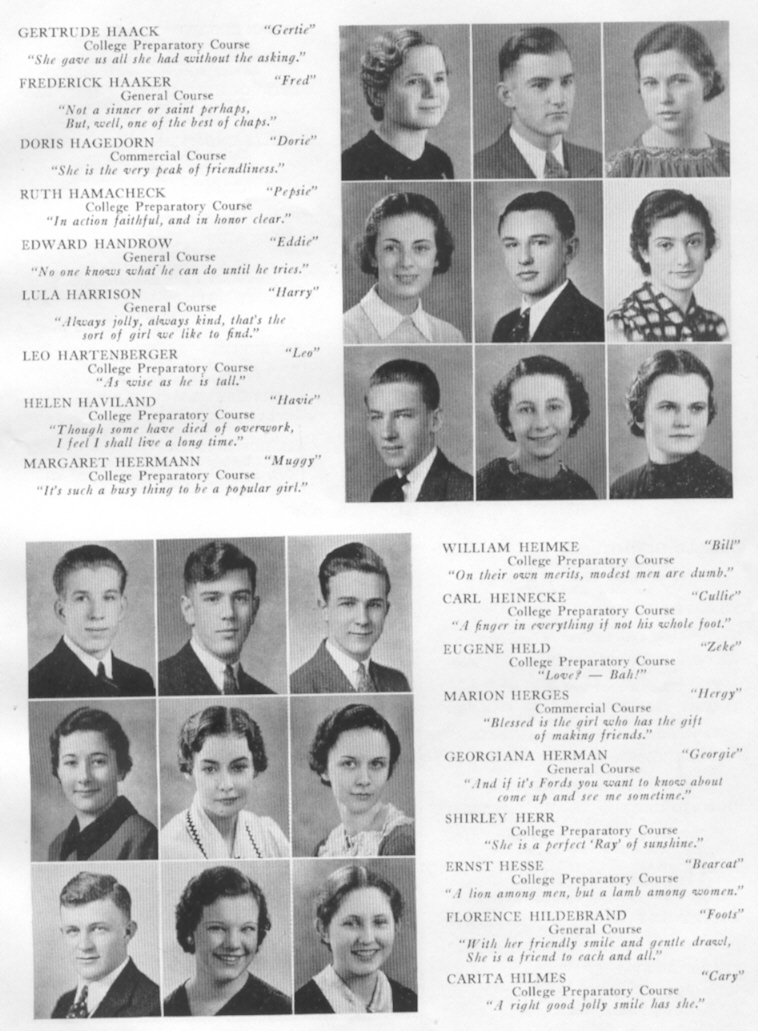 1935 Sheboygan High School, Page 85: Gertrude Haack, Frederick Haaker, Doris Hagedorn, Ruth Hammcheck, Edward Handrow, Lula Harrison, Leo Hartenberger, Helen Haviland, Margaret Heermann, William Heimke, Carl Heinecke, Eugene Held, Marion Herges, Georgiana Herman, Shirley Herr, Ernst Hesse, Florence Hildebrand, Carita Hilmes.