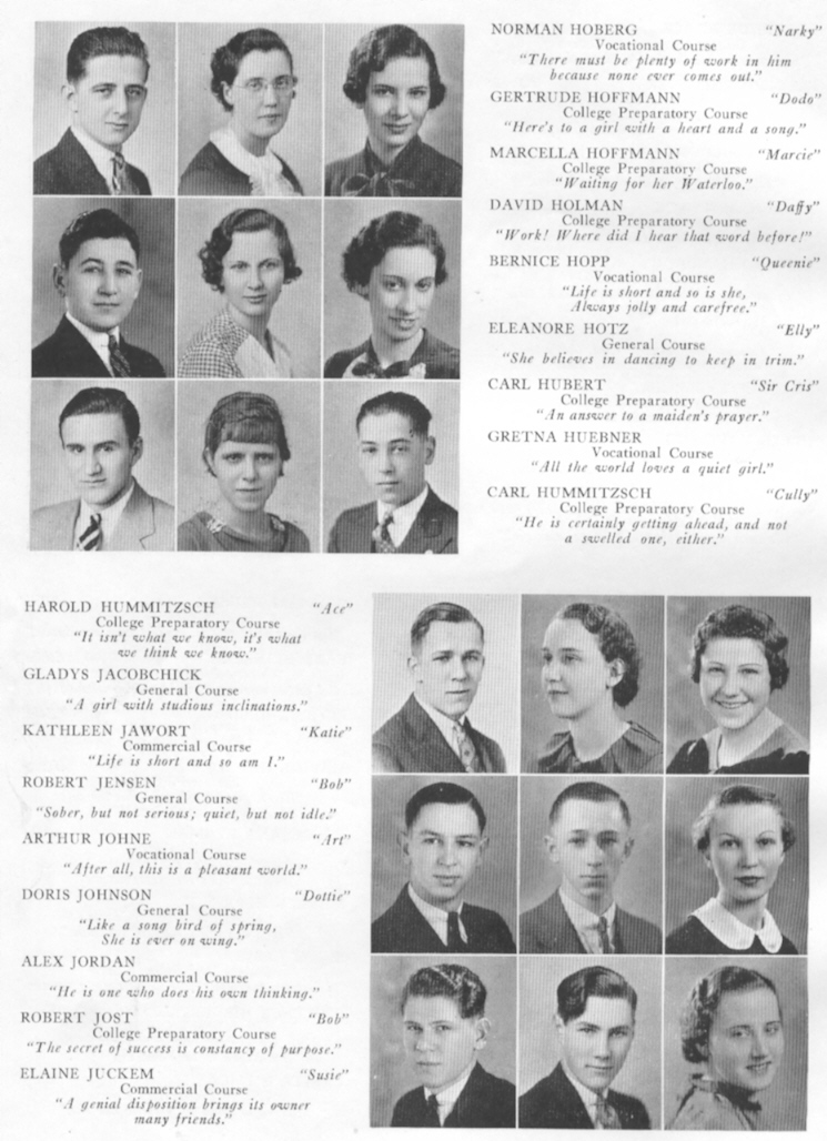 1935 Sheboygan High School, Page 86: Norman Hoberg, Gertrude Hoffmann, Marcella Hoffmann, David Holman, Bernice Hopp, Eleanore Hotz, Carl Hubert, Gretna Huebner, Carl Hummitzsch, Harold Hummitzsch, Gladys Jacobchick, Kathleen Jawort, Robert Jensen, Arthur Johne, Doris Johnson, Alex Jordan, Robert Jost, Elaine Juckems.