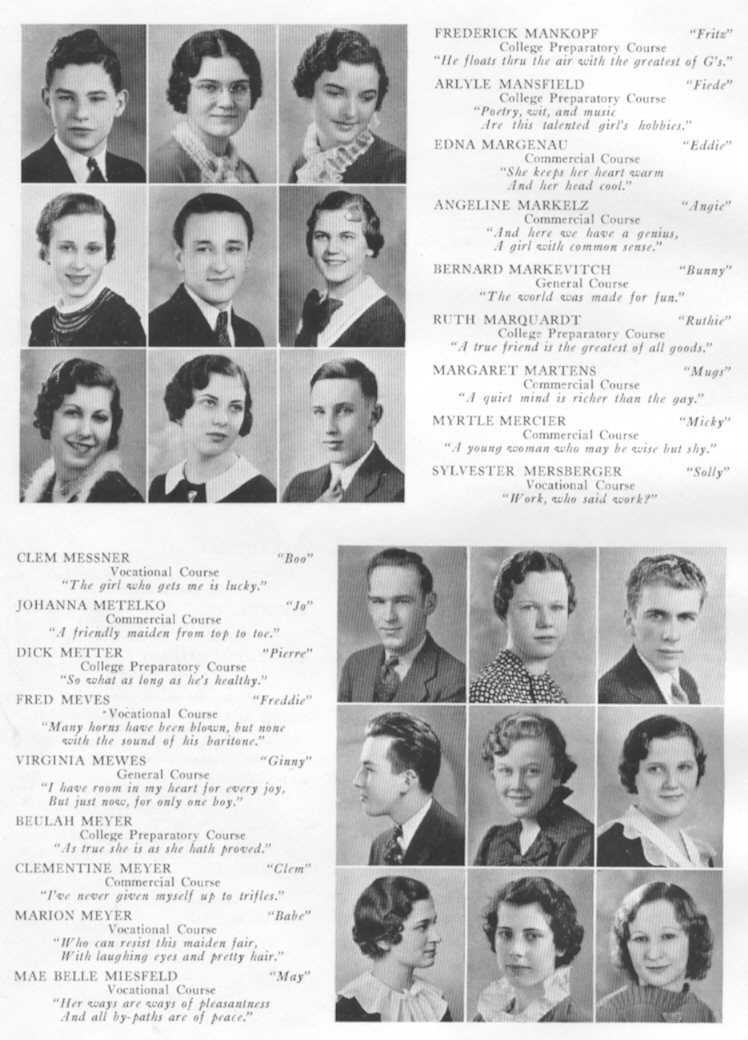 1935 Sheboygan High School, Page 90: Frederick Mankopf, Arlyle Mansfield, Edna Margenau, Angeline Markelz, Bernard Markevitch, Ruth Marquardt, Margaret Martens, Myrtle Mercier, Sylvester Mersberger, Clem Messner, Johanna Metelko, Dick Metter, Fred Meves, Virginia Mewes, Beulah Meyer, Clementine Meyer, Marion Meyer, Mae Belle Miesfeld.