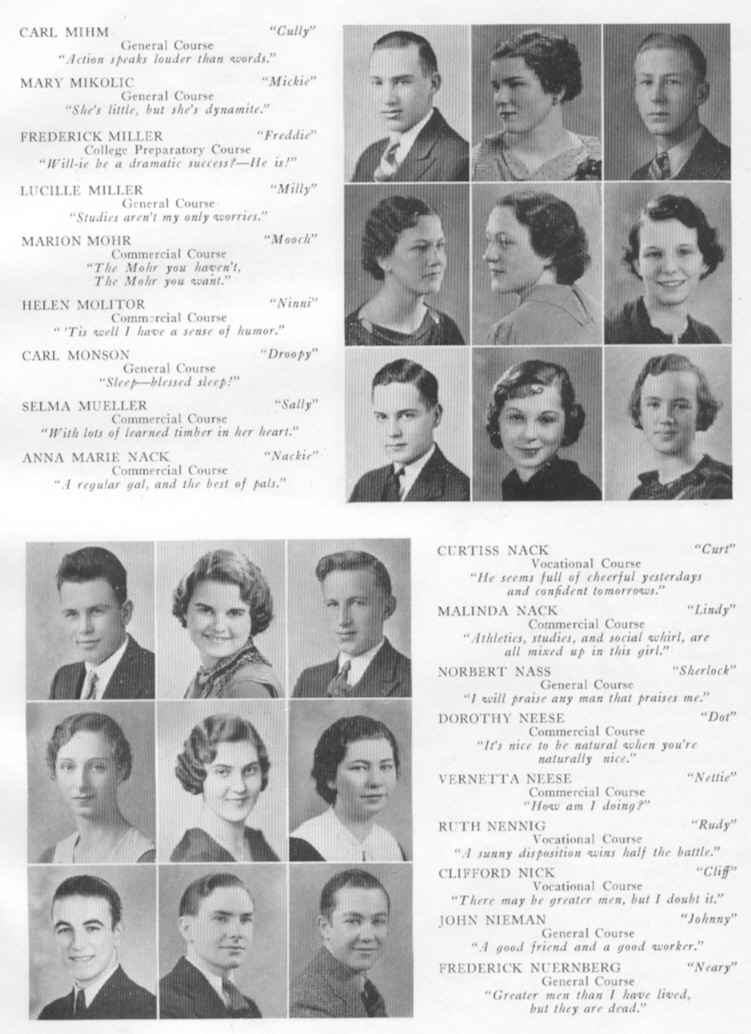 1935 Sheboygan High School, Page 91: Carl Mihm, Mary Mikolic, Frederick Miller, Lucille Miller, Marion Mohr, Helen Molitor, Carl Monson, Selma Mueller, Anna Nack, Curtiss Nack, Malinda Nack, Norbert Nass, Dorothy Neese, Vernetta Neese, Ruth Nennig, Clifford Nick, John Nieman, Frederick Nuernberg.