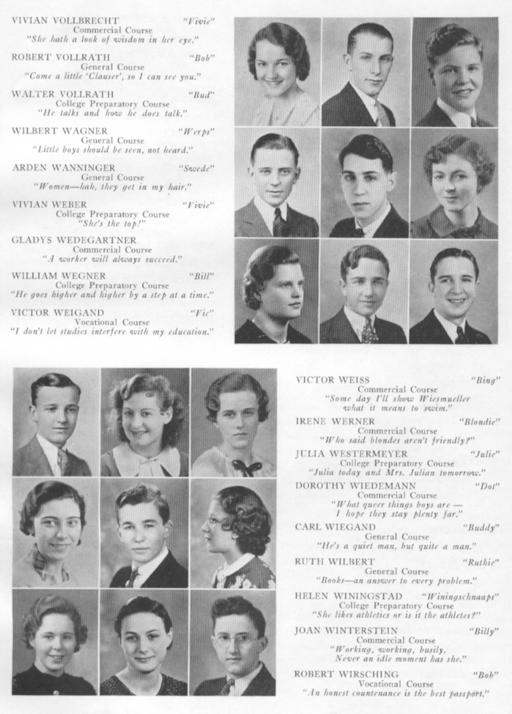 1935 Sheboygan High School, Page 97: Vivian Vollbrecht, Robert Vollrath, Walter Vollrath, Wilbert Wagner, Arden Wanninger, Vivian Weber, Gladys Wedegartner, William Wegner, Victor Weigand, Victor Weiss, Irene Werner, Julia Westermeyer, Dorothy Wiedemann, Carl Wiegand, Ruth Wilvert, Helen Winihgstad, Joan Winterstein, Robert Wirsching.
