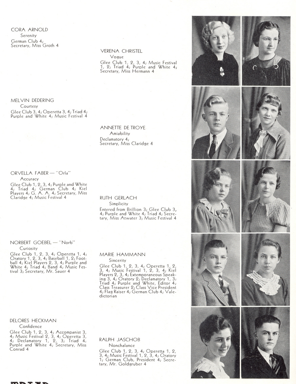 1936 Kiel High School, Page 10: Cora Arnold, Verene Christel, Melvin Dedering, Annette De Troye, Orvella Faber, Ruth Gerlach, Norbert Goebel, Marie Hammann, Delores Heckman, Ralph Jaschob.