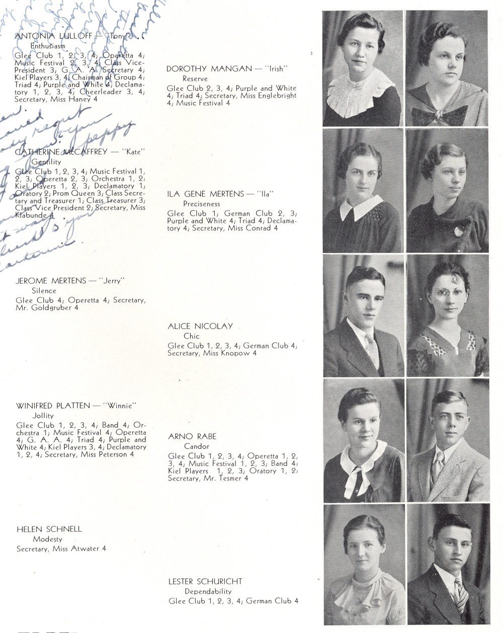 1936 Kiel High School, Page 12: Antonia Lulloff, Dorothy Mangan, Catherine McCaffrey, Ila Mertens, Jerome Mertens, Alice Nicolay, Winifred Platten, Arno Rabe, Helen Schnell, Lester Schuricht.