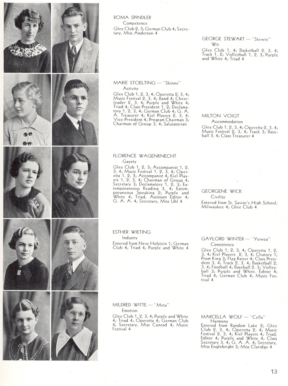 1936 Kiel High School, Page 13: Roma Spindler, George Stewart, Marie Stoelting, Milton Voigt, Florence Wagenknecht, Georgene Wick, Esther Wieting, Gaylord Winter, Mildred Witte, Marcella Wolf.