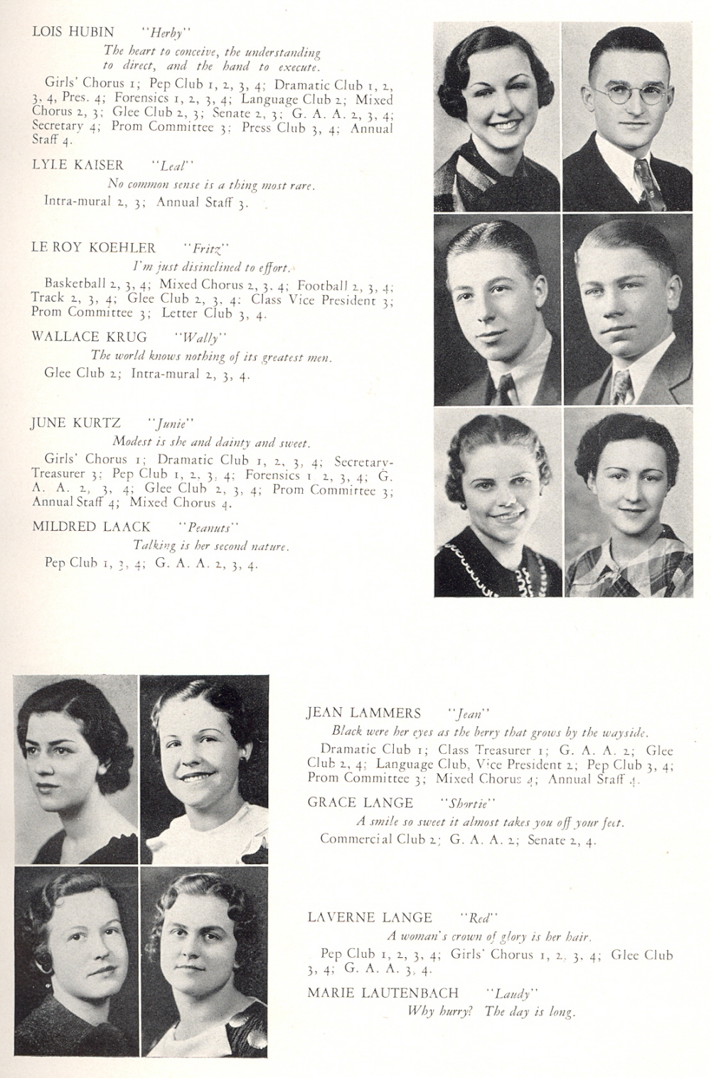 1936 Plymouth High School, Page 13: Lois Hubin, Lyle Kaiser, Le Roy Koehler, Wallace Krug, June Kurtz, Mildred Laack, Jean Lammers, Grace Lange, Laverne Lange, Marie Lautenbach.