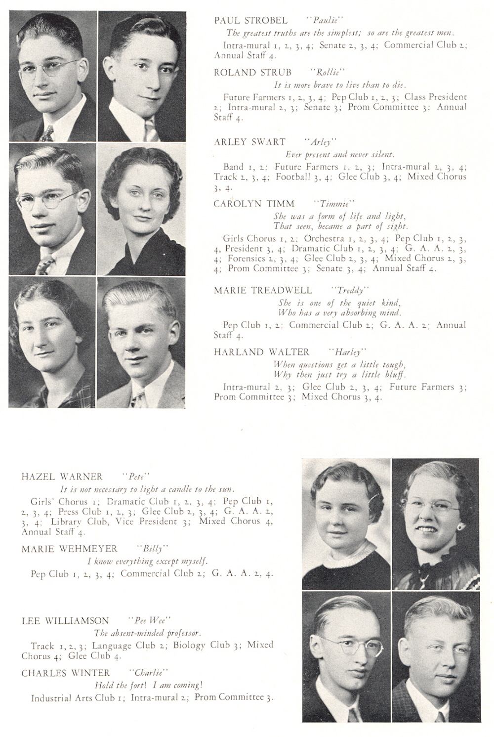1936 Plymouth High School, Page 18: Paul Strobel, Roland Strub, Arley Swart, Carolyn Timm, Marie Treadwell, Harland Walter, Hazel Warner, Marie Wehmeyer, Lee Williamson, Charles Winter.