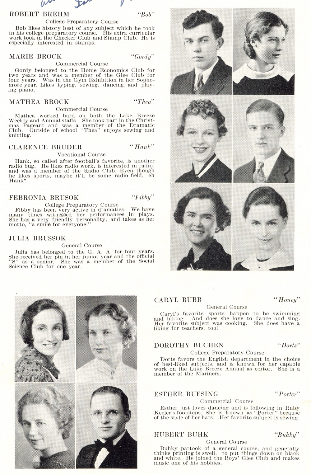 1936 Sheboygan High School, Page 27: Robert Brehm, Marie Brock, Mathea Brock, Clarence Bruder, Febronia Brusok, Julia Brussok, Caryl Bubb, Dorothy Buchen, Esther Buesing, Hubert Buhk.