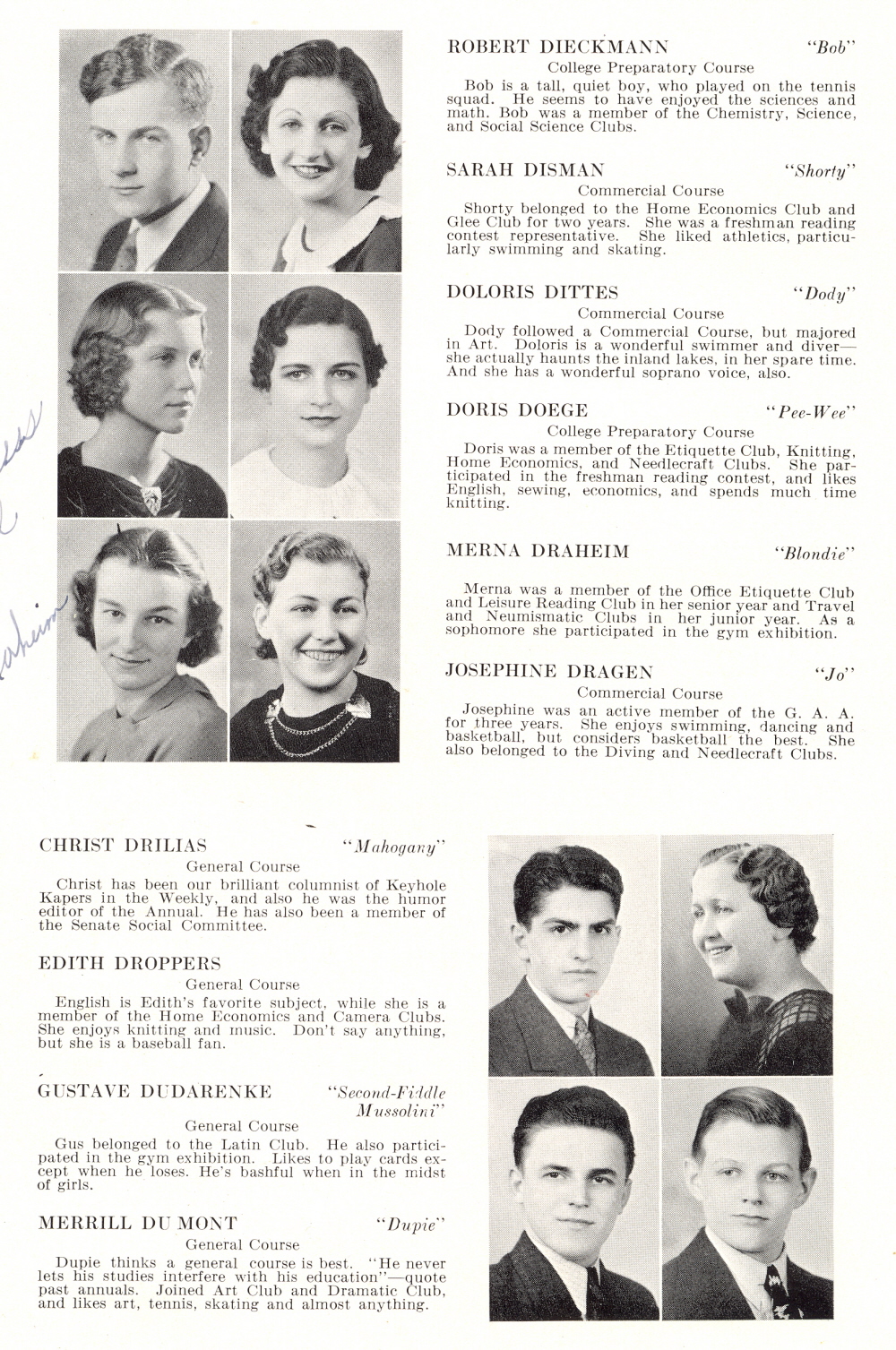 1936 Sheboygan High School, Page 30: Robert Dieckmann, Sarah Disman, Dolores Dittes, Doris Doege, Merna Draheim, Josephine Dragen, Christ Drilias, Edith Droppers, Gustave Dudarenke, Merrill Du Mont.
