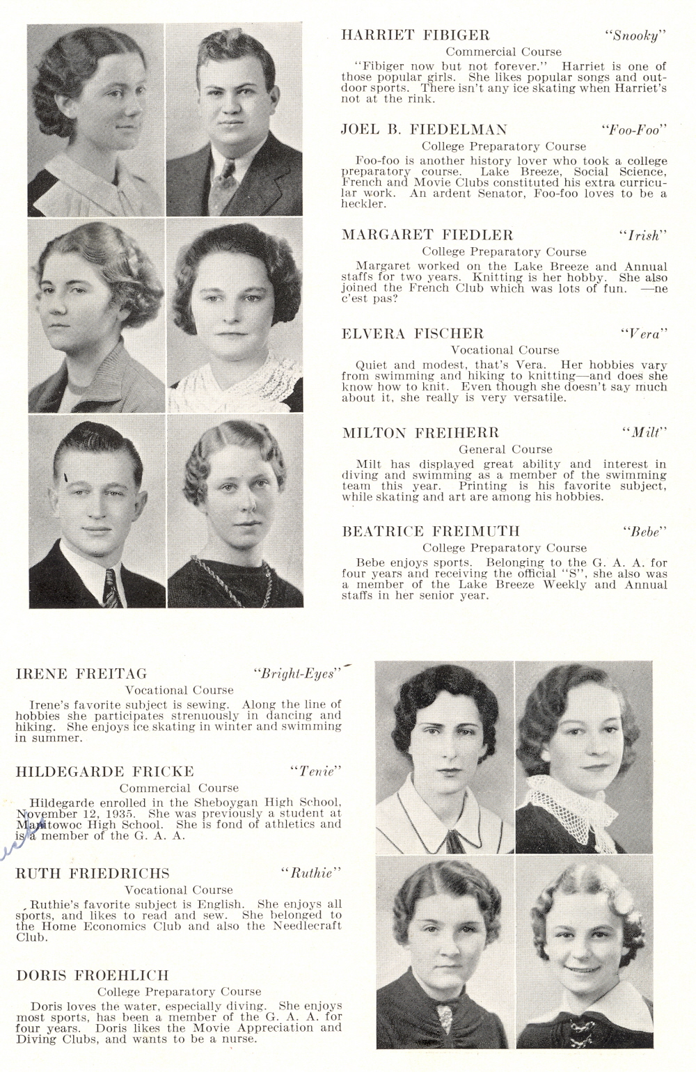 1936 Sheboygan High School, Page 32: Harriet Fibiger, Joel Fiedelman, Margaret Fiedler, Elvera Fischer, Milton Freiherr, Beatrice Freimuth, Irene Freitag, Hildegarde Fricke, Ruth Friedrichs, Doris Froehlich.