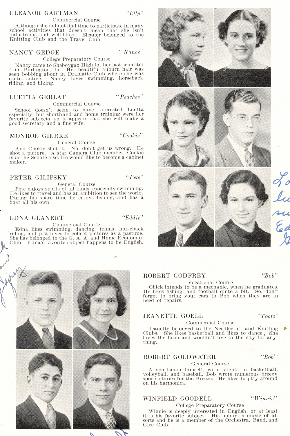 1936 Sheboygan High School, Page 33: Eleanor Gartman, Nancy Gedge, Luetta Gerlat, Monroe Gierke, Peter Gilipsky, Edna Glanert, Robert Godfrey, Jeanette Goell, Robert Goldwater, Winfield Goodell.