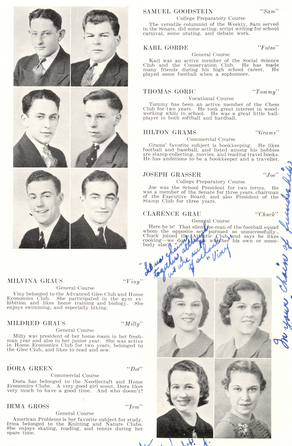 1936 Sheboygan High School, Page 34: Samuel Goodstein, Karl Gorde, Thomas Goric, Hilton Grams, Joseph Grasser, Clarence Grau, Milvina Graus, Mildred Graus, Dora Green, Irma Gross.