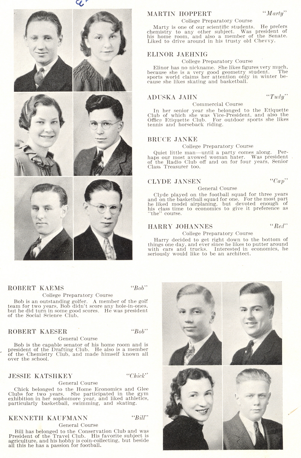 1936 Sheboygan High School, Page 38: Martin Hoppert, Elinor Jaehnig, Aduska John, Bruce Janke, Clyde Jansen, Harry Johannes, Robert Kaems, Robert Kaeser, Jessie Katshkey, Kenneth Kaufmann.